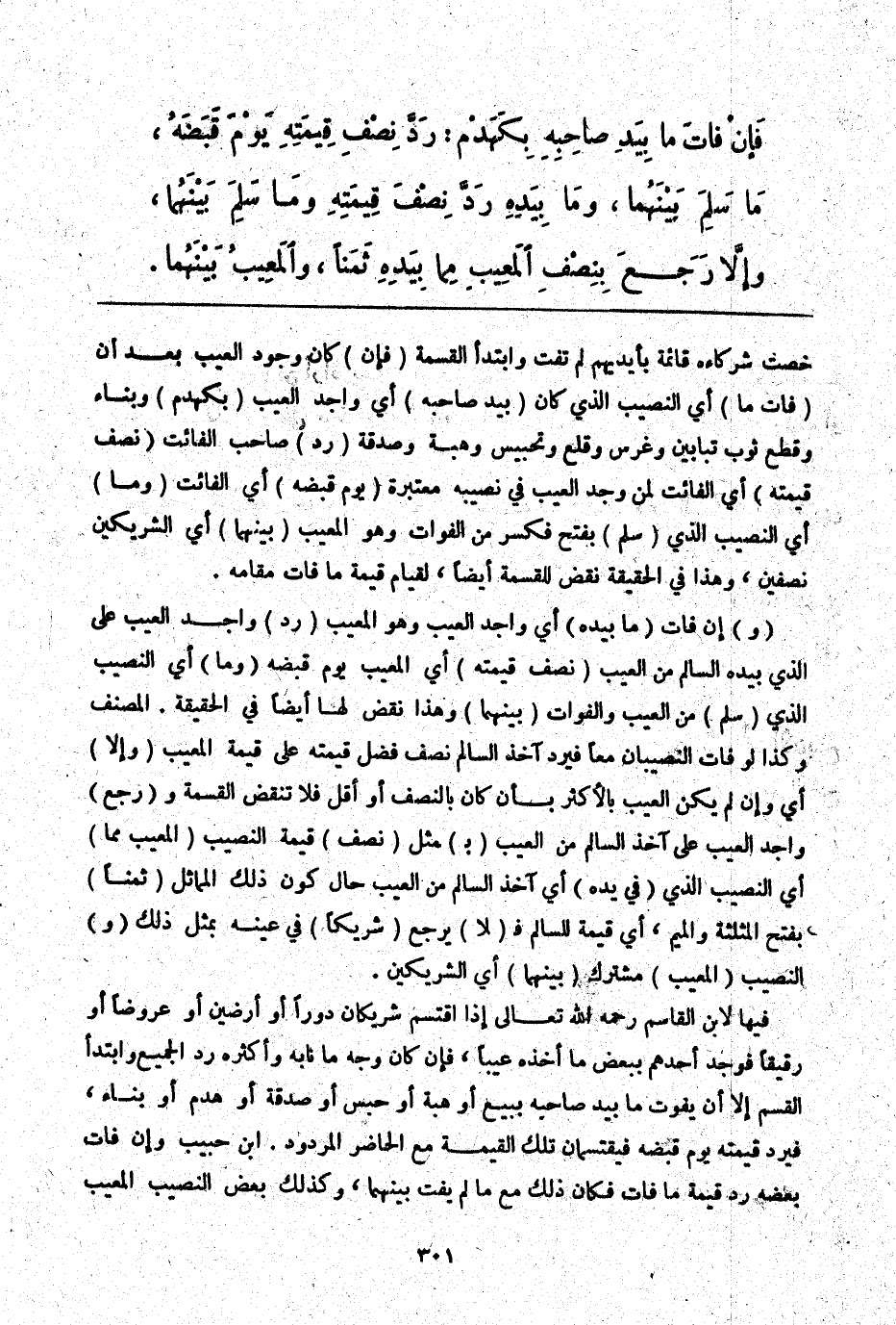 ـــــــــــــــــــــــــــــQخَصَّتْ شُرَكَاءَهُ قَائِمَةً بِأَيْدِيهِمْ لَمْ تَفُتْ وَابْتَدَأَ الْقِسْمَةَ (فَإِنْ) كَانَ وُجُودُ الْعَيْبِ بَعْدَ أَنْ (فَاتَ مَا) أَيْ النَّصِيبُ الَّذِي كَانَ (بِيَدِ صَاحِبِهِ) أَيْ وَاجِدِ الْعَيْبِ (بِكَهَدْمٍ) وَبِنَاءٍ وَقَطْعِ ثَوْبٍ تَبَابِينَ وَغَرْسٍ وَقَلْعٍ وَتَحْبِيسٍ وَهِبَةٍ وَصَدَقَةٍ (رَدَّ) صَاحِبُ الْفَائِتِ (نِصْفَ قِيمَتِهِ) أَيْ الْفَائِتِ لِمَنْ وَجَدَ الْعَيْبَ فِي نَصِيبِهِ مُعْتَبَرَةً (يَوْمَ قَبْضِهِ) أَيْ الْفَائِتِ (وَمَا) أَيْ النَّصِيبُ الَّذِي (سَلِمَ) بِفَتْحٍ فَكَسْرٍ مِنْ الْفَوَاتِ وَهُوَ الْمَعِيبُ (بَيْنَهُمَا) أَيْ الشَّرِيكَيْنِ نِصْفَيْنِ، وَهَذَا فِي الْحَقِيقَةِ نَقْضٌ لِلْقِسْمَةِ أَيْضًا لِقِيَامِ قِيمَةِ مَا فَاتَ مَقَامَهُ.