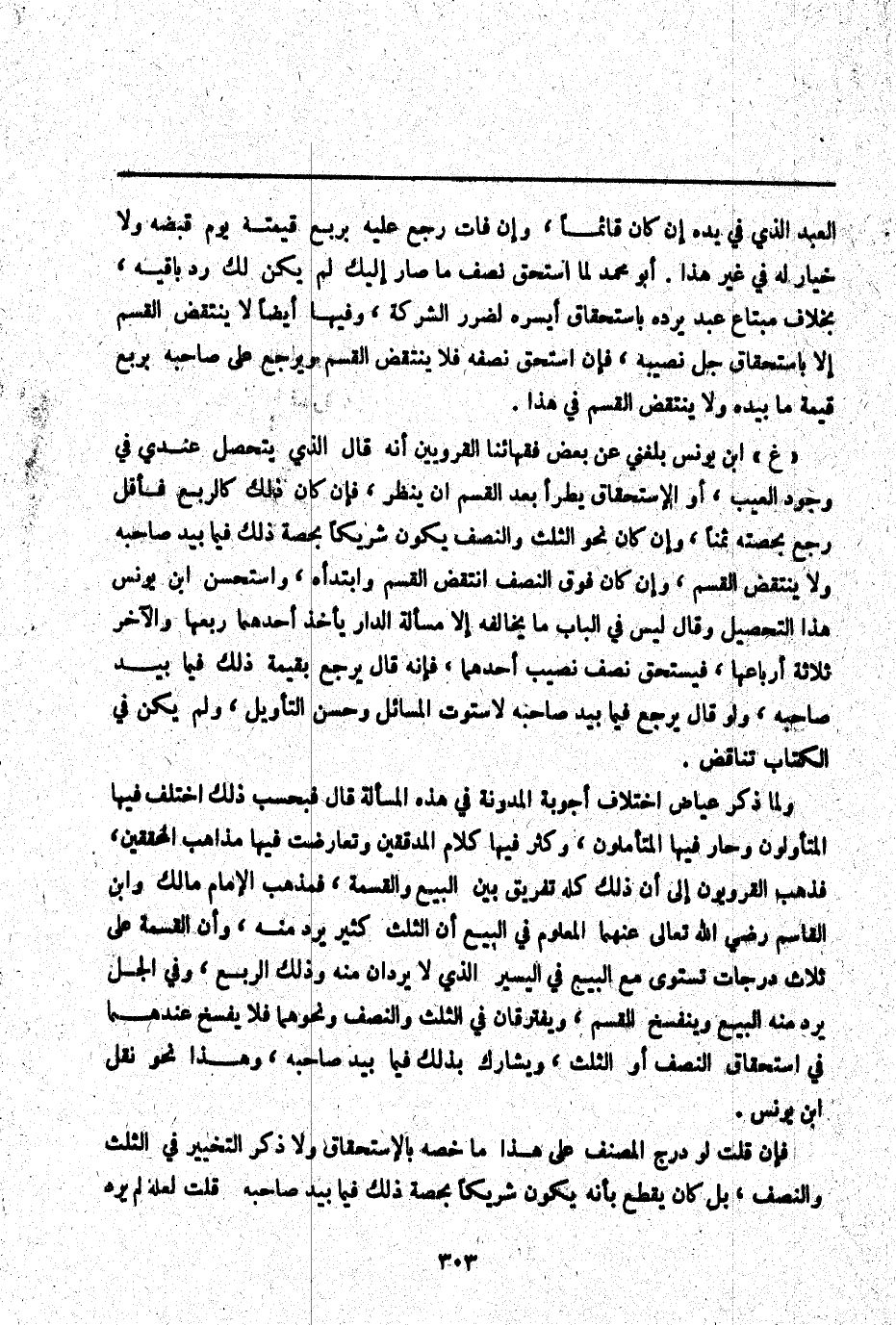 وَلَمَّا ذَكَرَ عِيَاضٌ اخْتِلَافَ أَجْوِبَةِ الْمُدَوَّنَةِ فِي هَذِهِ الْمَسْأَلَةِ قَالَ فَبِحَسَبِ ذَلِكَ اخْتَلَفَ فِيهَا الْمُتَأَوِّلُونَ وَحَارَ فِيهَا الْمُتَأَمِّلُونَ، وَكَثُرَ فِيهَا كَلَامُ الْمُدَقِّقِينَ وَتَعَارَضَتْ فِيهَا مَذَاهِبُ الْمُحَقِّقِينَ، فَذَهَبَ الْقَرَوِيُّونَ إلَى أَنَّ ذَلِكَ كُلَّهُ تَفْرِيقٌ بَيْنَ الْبَيْعِ وَالْقِسْمَةِ، فَمَذْهَبُ الْإِمَامِ مَالِكٍ وَابْنُ الْقَاسِمِ - رَضِيَ اللَّهُ تَعَالَى عَنْهُمَا - الْمَعْلُومُ فِي الْبَيْعِ أَنَّ الثُّلُثَ كَثِيرٌ يُرَدُّ مِنْهُ، وَأَنَّ الْقِسْمَةَ عَلَى ثَلَاثِ دَرَجَاتٍ تَسْتَوِي مَعَ الْبَيْعِ فِي الْيَسِيرِ الَّذِي لَا يَرُدَّانِ مِنْهُ وَذَلِكَ الرُّبْعُ، وَفِي الْجُلِّ يُرَدُّ مِنْهُ الْبَيْعُ وَيَنْفَسِخُ الْقَسْمُ، وَيَفْتَرِقَانِ فِي الثُّلُثِ وَالنِّصْفِ وَنَحْوِهِمَا فَلَا يُفْسَخُ عِنْدَهُمَا فِي اسْتِحْقَاقِ النِّصْفِ أَوْ الثُّلُثِ، وَيُشَارِكُ بِذَلِكَ فِيمَا بِيَدِ صَاحِبِهِ، وَهَذَا نَحْوُ نَقْلِ ابْنِ يُونُسَ.