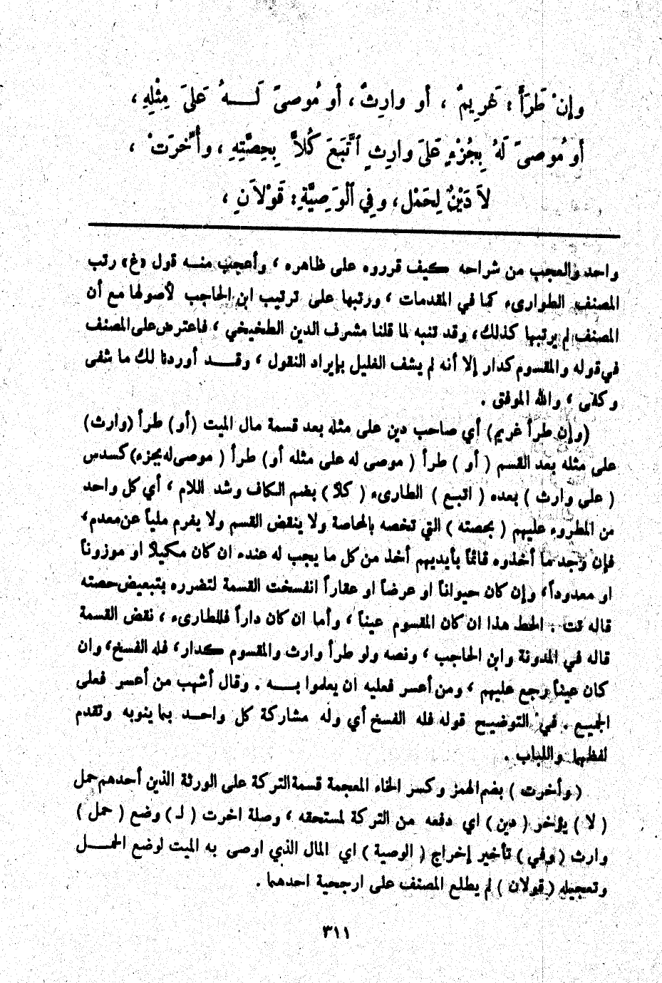 (وَإِنْ طَرَأَ غَرِيمٌ) أَيْ صَاحِبُ دَيْنٍ عَلَى مِثْلِهِ بَعْدَ قِسْمَةِ مَالِ الْمَيِّتِ (أَوْ) طَرَأَ (وَارِثٌ) عَلَى مِثْلِهِ بَعْدَ الْقَسْمِ (أَوْ) طَرَأَ (مُوصًى لَهُ عَلَى مِثْلِهِ أَوْ) طَرَأَ (مُوصًى لَهُ بِجُزْءٍ) كَسُدُسٍ (عَلَى وَارِثٍ) بَعْدَهُ (اتَّبَعَ) الطَّارِئُ (كُلًّا) بِضَمِّ الْكَافِ وَشَدِّ اللَّامِ، أَيْ كُلَّ وَاحِدٍ مِنْ الْمَطْرُوءِ عَلَيْهِمْ (بِحِصَّتِهِ) الَّتِي تَخُصُّهُ بِالْمُحَاصَّةِ وَلَا يُنْقَضُ الْقَسْمُ وَلَا يُغَرِّمُ مَلِيًّا عَنْ مُعْدِمٍ، فَإِنْ وَجَدَ مَا أَخَذُوهُ قَائِمًا بِأَيْدِيهِمْ أَخَذَ مِنْ كُلِّ مَا يَجِبُ لَهُ عِنْدَهُ إنْ كَانَ مَكِيلًا أَوْ مَوْزُونًا أَوْ مَعْدُودًا، وَإِنْ كَانَ حَيَوَانًا أَوْ عَرْضًا أَوْ عَقَارًا انْفَسَخَتْ الْقِسْمَةُ لِتَضَرُّرِهِ بِتَبْعِيضِ حِصَّتِهِ قَالَهُ تت. الْحَطّ هَذَا إنْ كَانَ الْمَقْسُومُ عَيْنًا، وَأَمَّا إنْ كَانَ دَارًا فَلِلطَّارِئِ، نَقْضُ الْقِسْمَةِ قَالَهُ فِي الْمُدَوَّنَةِ وَابْنِ الْحَاجِبِ، وَنَصُّهُ وَلَوْ طَرَأَ وَارِثٌ وَالْمَقْسُومُ كَدَارٍ، فَلَهُ الْفَسْخُ، وَإِنْ كَانَ عَيْنًا رَجَعَ عَلَيْهِمْ، وَمَنْ أَعْسَرَ فَعَلَيْهِ أَنْ يَعْلَمُوا بِهِ. وَقَالَ أَشْهَبُ مَنْ أَعْسَرَ فَعَلَى الْجَمِيعِ. فِي التَّوْضِيحِ قَوْلُهُ فَلَهُ الْفَسْخُ أَيْ وَلَهُ مُشَارَكَةُ كُلِّ وَاحِدٍ بِمَا يَنُوبُهُ وَتَقَدَّمَ لَفْظُهُمَا وَاللُّبَابِ.