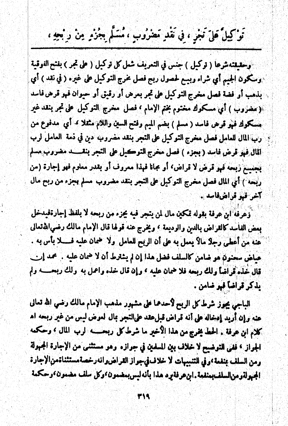 تَوْكِيلٌ عَلَى تَجْرٍ، وَفِي نَقْدٍ مَضْرُوبٍ، مُسَلَّمٍ بِجُزْءٍ مِنْ رِبْحِهِ