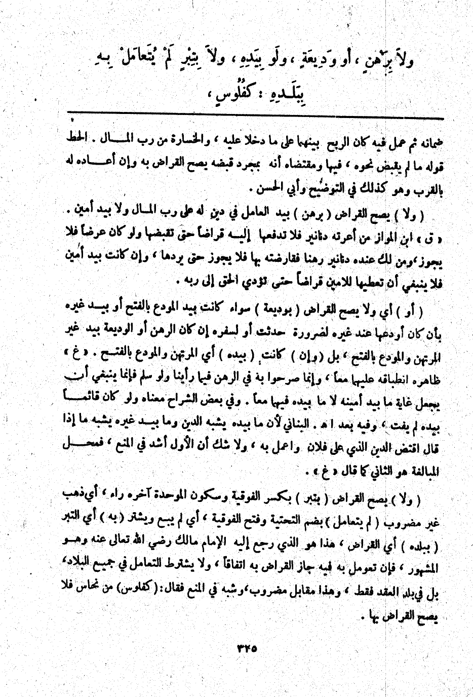 (وَلَا) يَصِحُّ الْقِرَاضُ (بِتِبْرٍ) بِكَسْرِ الْفَوْقِيَّةِ وَسُكُونِ الْمُوَحَّدَةِ آخِرُهُ رَاءٌ، أَيْ ذَهَبٌ غَيْرُ مَضْرُوبٍ (لَمْ يُتَعَامَلْ) بِضَمِّ التَّحْتِيَّةِ وَفَتْحِ الْفَوْقِيَّةِ، أَيْ لَمْ يُبَعْ وَيُشْتَرَ (بِهِ) أَيْ التِّبْرِ (بِبَلَدِهِ) أَيْ الْقِرَاضِ، هَذَا هُوَ الَّذِي رَجَعَ إلَيْهِ الْإِمَامُ مَالِكٌ - رَضِيَ اللَّهُ تَعَالَى عَنْهُ - وَهُوَ الْمَشْهُورُ، فَإِنْ تُعُومِلَ بِهِ فِيهِ جَازَ الْقِرَاضُ بِهِ اتِّفَاقًا، وَلَا يُشْتَرَطُ التَّعَامُلُ فِي جَمِيعِ الْبِلَادِ، بَلْ فِي بَلَدِ الْعَقْدِ فَقَطْ، وَهَذَا مُقَابِلُ مَضْرُوبٍ، وَشَبَّهَ فِي الْمَنْعِ فَقَالَ: (كَفُلُوسٍ) مِنْ نُحَاسٍ فَلَا يَصِحُّ الْقِرَاضُ بِهَا.