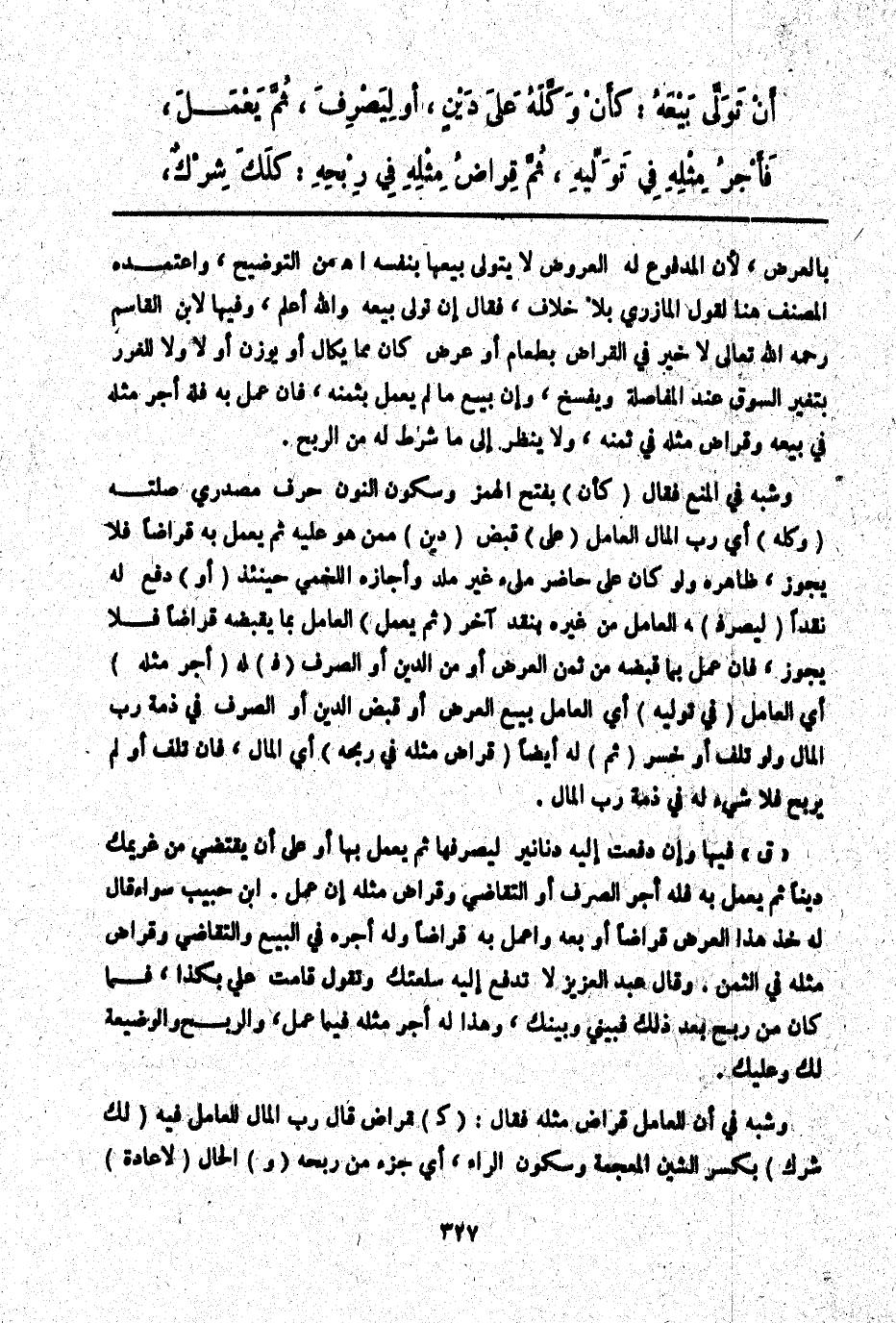 ـــــــــــــــــــــــــــــQبِالْعَرْضِ لِأَنَّ الْمَدْفُوعَ لَهُ الْعُرُوض لَا يَتَوَلَّى بَيْعَهَا بِنَفْسِهِ. اهـ مِنْ التَّوْضِيحِ وَاعْتَمَدَهُ الْمُصَنِّفُ هُنَا لِقَوْلِ الْمَازِرِيِّ بِلَا خِلَافٍ، فَقَالَ إنْ تَوَلَّى بَيْعَهُ وَاَللَّهُ أَعْلَمُ، وَفِيهَا لِابْنِ الْقَاسِمِ - رَحِمَهُ اللَّهُ تَعَالَى - لَا خَيْرَ فِي الْقِرَاضِ بِطَعَامٍ أَوْ عَرْضٍ كَانَ مِمَّا يُكَالُ أَوْ يُوزَنُ أَوْ لَا وَلَا لِلْغَرَرِ بِتَغَيُّرِ السُّوقِ عِنْدَ الْمُفَاصَلَةِ وَيُفْسَخُ، وَإِنْ بِيعَ مَا لَمْ يَعْمَلْ بِثَمَنِهِ، فَإِنْ عَمِلَ بِهِ فَلَهُ أَجْرُ مِثْلِهِ فِي بَيْعِهِ وَقِرَاضُ مِثْلِهِ فِي ثَمَنِهِ، وَلَا يُنْظَرُ إلَى مَا شُرِطَ لَهُ مِنْ الرِّبْحِ.
