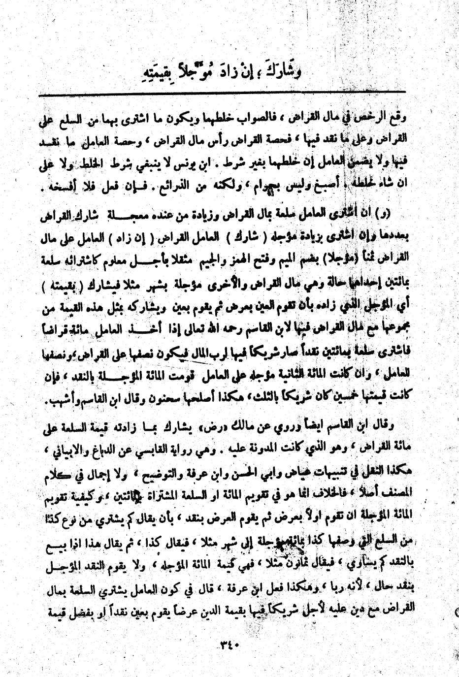 وَقَالَ ابْنُ الْقَاسِمِ أَيْضًا وَرُوِيَ عَنْ مَالِكٍ " - رَضِيَ اللَّهُ عَنْهُ - " يُشَارِكُ بِمَا زَادَتْهُ قِيمَةُ السِّلْعَةِ عَلَى مِائَةِ الْقِرَاضِ، وَهُوَ الَّذِي كَانَتْ الْمُدَوَّنَةُ عَلَيْهِ. وَهِيَ رِوَايَةُ الْقَابِسِيِّ عَنْ الدَّبَّاغِ الْإِبْيَانِيِّ، هَكَذَا النَّقْلُ فِي تَنْبِيهَاتِ عِيَاضٍ وَأَبِي الْحَسَنِ وَابْنِ عَرَفَةَ وَالتَّوْضِيحِ، وَلَا إجْمَالَ فِي كَلَامِ الْمُصَنِّفِ أَصْلًا، فَالْخِلَافُ إنَّمَا هُوَ فِي تَقْوِيمِ الْمِائَةِ أَوْ السِّلْعَةِ الْمُشْتَرَاةِ بِالْمِائَتَيْنِ، وَكَيْفِيَّةِ تَقْوِيمِ الْمِائَةِ الْمُؤَجَّلَةِ أَنْ تُقَوَّمَ أَوَّلًا بِعَرْضٍ ثُمَّ يُقَوَّمُ الْعَرْضُ بِنَقْدٍ، بِأَنْ يُقَالَ كَمْ يُشْتَرَى مِنْ نَوْعِ كَذَا مِنْ السِّلَعِ الَّتِي وَصْفُهَا كَذَا بِمِائَةٍ مُؤَجَّلَةٍ إلَى شَهْرٍ مَثَلًا، فَيُقَالُ كَذَا، ثُمَّ يُقَالُ هَذَا إذَا بِيعَ بِالنَّقْدِ كَمْ يُسَاوِي، فَيُقَالُ ثَمَانُونَ مَثَلًا، فَهِيَ قِيمَةُ الْمِائَةِ الْمُؤَجَّلَةِ، وَلَا يُقَوَّمُ النَّقْدُ الْمُؤَجَّلُ بِنَقْدٍ حَالٍّ لِأَنَّهُ رِبًا، وَهَكَذَا فَعَلَ ابْنُ عَرَفَةَ، قَالَ فِي كَوْنِ الْعَامِلِ يَشْتَرِي السِّلْعَةَ بِمَالِ الْقِرَاضِ مَعَ دَيْنٍ عَلَيْهِ لِأَجَلٍ شَرِيكًا فِيهَا بِقِيمَةِ الدَّيْنِ عَرْضًا يُقَوَّمُ بِعَيْنٍ نَقْدًا أَوْ بِفَضْلِ قِيمَةِ