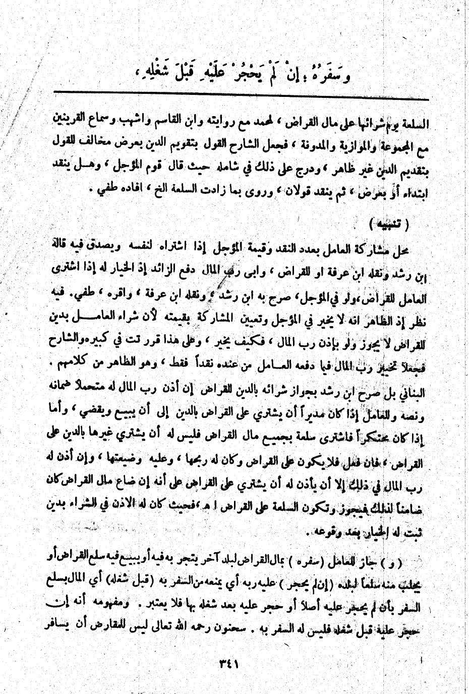 (وَ) جَازَ لِلْعَامِلِ (سَفَرُهُ) بِمَالٍ الْقِرَاضِ لِبَلَدٍ آخَرَ يَتَّجِرُ بِهِ فِيهِ أَوْ يَبِيعُ فِيهِ سِلَعَ الْقِرَاضِ أَوْ يَجْلِبُ مِنْهُ سِلَعًا لِبَلَدِهِ (إنْ لَمْ يَحْجُرْ) عَلَيْهِ رَبُّهُ أَيْ يَمْنَعُهُ مِنْ السَّفَرِ بِهِ (قَبْلَ شُغْلِهِ) أَيْ الْمَالِ بِسِلَعِ السَّفَرِ بِأَنْ لَمْ يَحْجُرْ عَلَيْهِ أَصْلًا أَوْ حَجَرَ عَلَيْهِ بَعْدَ شُغْلِهِ بِهَا فَلَا يُعْتَبَرُ. وَمَفْهُومُهُ أَنَّهُ إنْ حَجَرَ عَلَيْهِ قَبْلَ شُغْلِهِ فَلَيْسَ لَهُ السَّفَرُ بِهِ. سَحْنُونٌ - رَحِمَهُ اللَّهُ تَعَالَى - لَيْسَ لِلْمُقَارِضِ أَنْ يُسَافِرَ