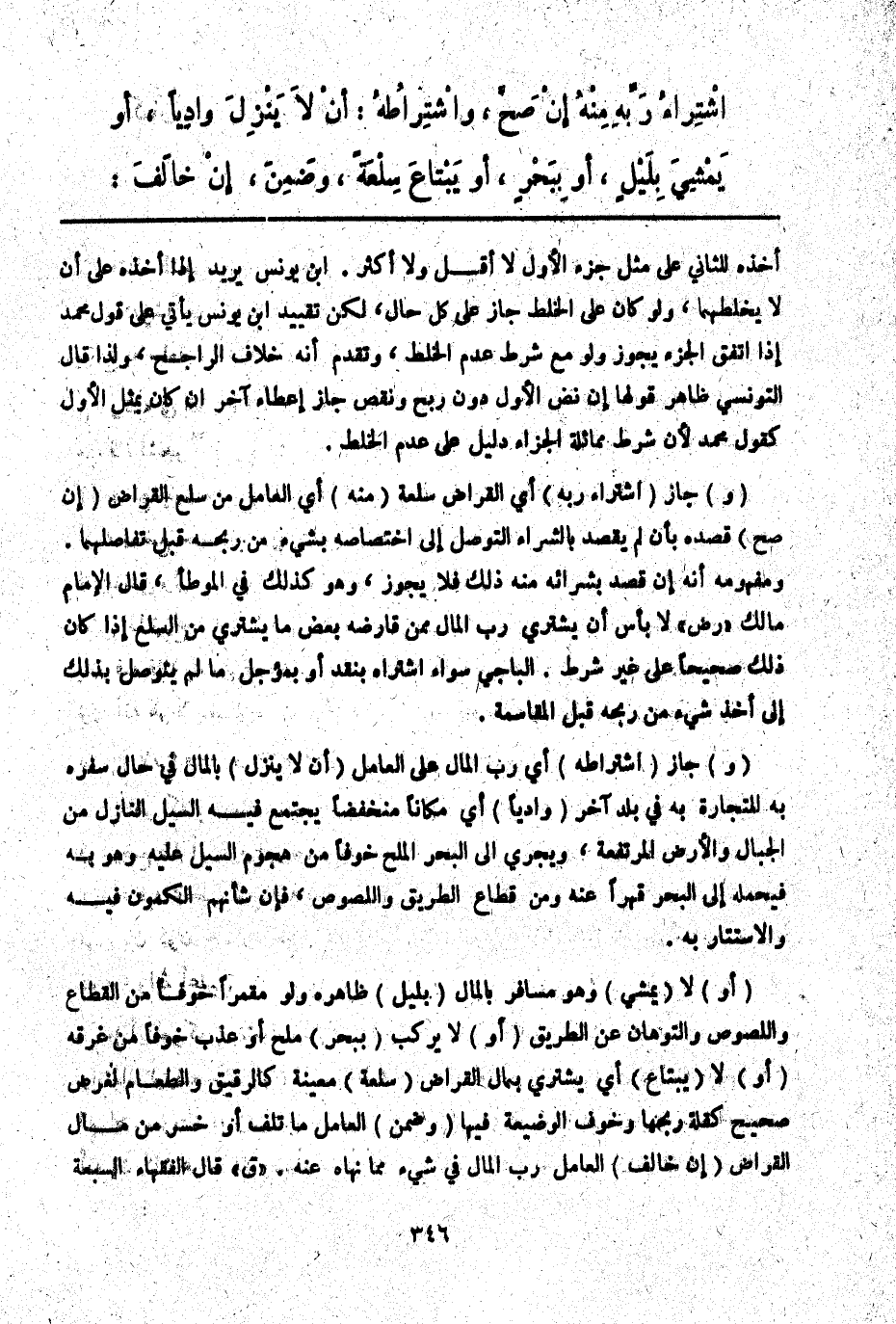 (وَ) جَازَ (اشْتِرَاطُهُ) أَيْ رَبِّ الْمَالِ عَلَى الْعَامِلِ (أَنْ لَا يَنْزِلَ) بِالْمَالِ فِي حَالِ سَفَرِهِ بِهِ لِلتِّجَارَةِ بِهِ فِي بَلَدٍ آخَرَ (وَادِيًا) أَيْ مَكَانًا مُنْخَفِضًا يَجْتَمِعُ فِيهِ السَّيْلُ النَّازِلُ مِنْ الْجِبَالِ وَالْأَرْضِ الْمُرْتَفِعَةِ، وَيَجْرِي إلَى الْبَحْرِ الْمِلْحِ خَوْفًا مِنْ هُجُومِ السَّيْلِ عَلَيْهِ وَهُوَ بِهِ فَيَحْمِلُهُ إلَى الْبَحْرِ قَهْرًا عَنْهُ وَمِنْ قُطَّاعِ الطَّرِيقِ وَاللُّصُوصِ، فَإِنَّ شَأْنَهُمْ الْكُمُونُ فِيهِ وَالِاسْتِتَارُ بِهِ.