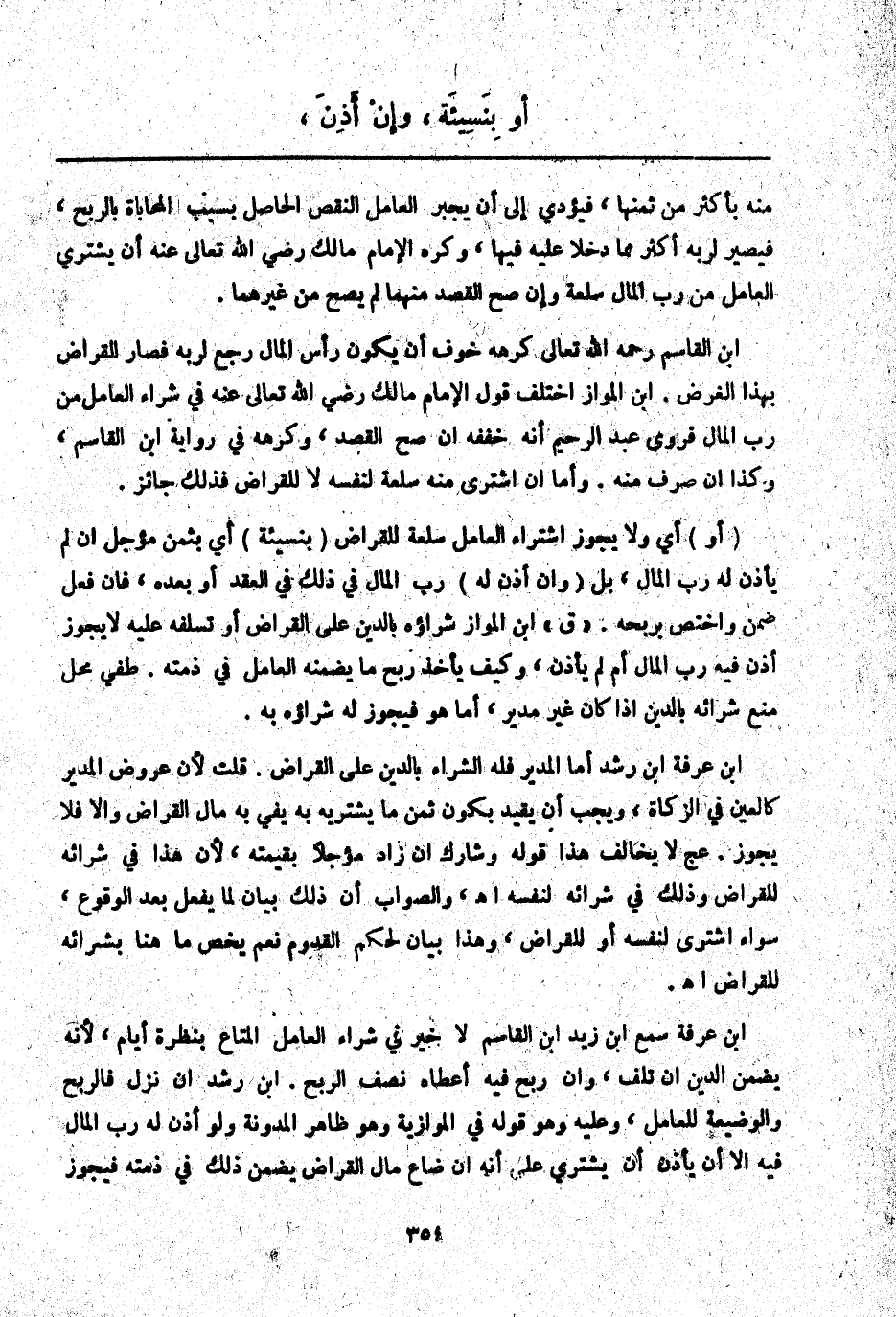 (أَوْ) أَيْ وَلَا يَجُوزُ اشْتِرَاءُ الْعَامِلِ سِلْعَةً لِلْقِرَاضِ (بِنَسِيئَةٍ) أَيْ بِثَمَنٍ مُؤَجَّلٍ إنْ لَمْ يَأْذَنْ لَهُ رَبُّ الْمَالِ، بَلْ (وَإِنْ أَذِنَ لَهُ) رَبُّ الْمَالِ فِي ذَلِكَ فِي الْعَقْدِ أَوْ بَعْدَهُ، فَإِنْ فَعَلَ ضَمِنَ وَاخْتَصَّ بِرِبْحِهِ. " ق " ابْنُ الْمَوَّازِ شِرَاؤُهُ بِالدَّيْنِ عَلَى الْقِرَاضِ أَوْ تَسَلُّفُهُ عَلَيْهِ لَا يَجُوزُ أَذِنَ فِيهِ رَبُّ الْمَالِ أَمْ لَمْ يَأْذَنْ، وَكَيْفَ يَأْخُذُ رِبْحَ مَا يَضْمَنُهُ الْعَامِلُ فِي ذِمَّتِهِ.