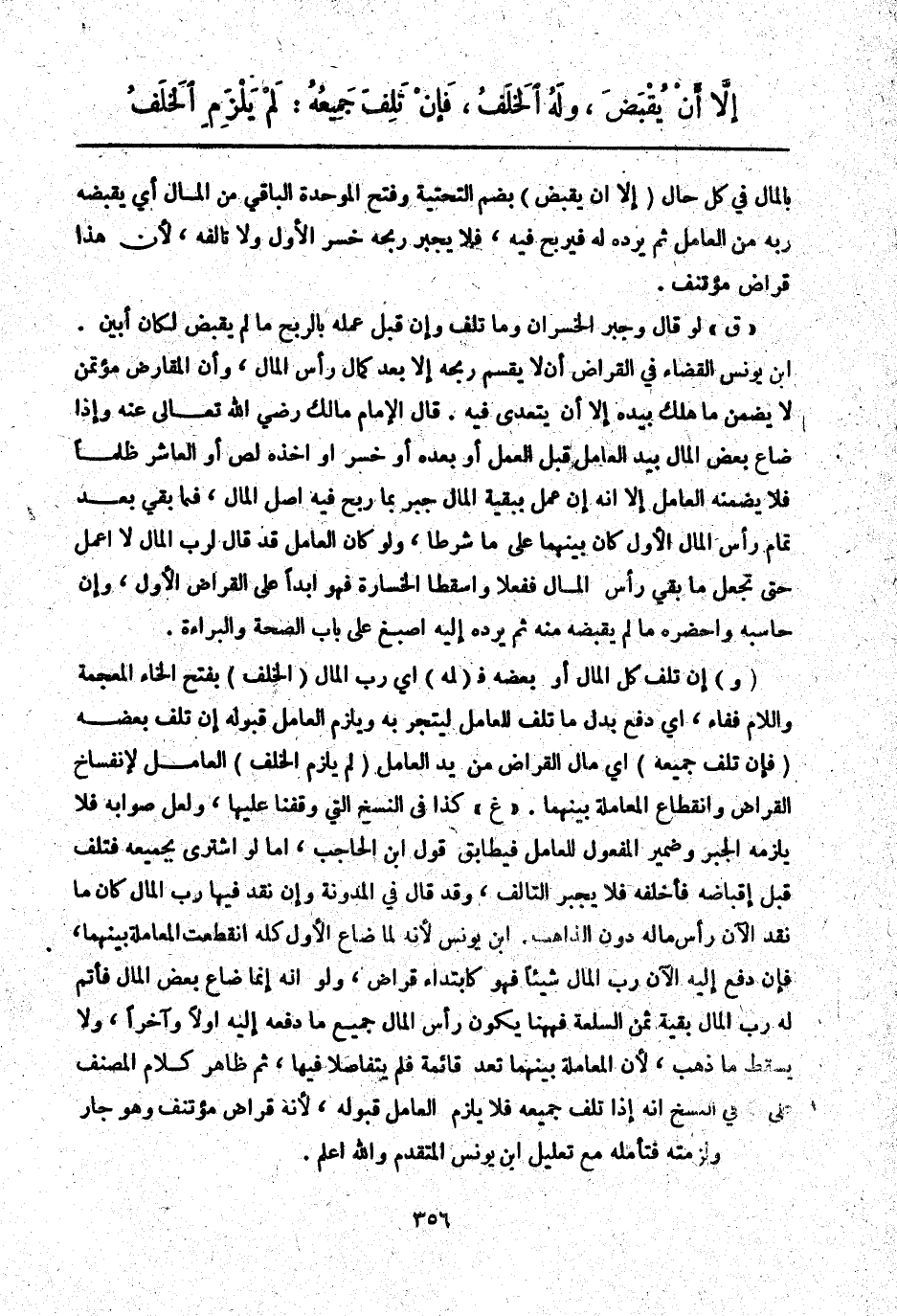 ـــــــــــــــــــــــــــــQبِالْمَالِ فِي كُلِّ حَالٍ (إلَّا أَنْ يُقْبَضَ) بِضَمِّ التَّحْتِيَّةِ وَفَتْحِ الْمُوَحَّدَةِ الْبَاقِي مِنْ الْمَالِ أَيْ يَقْبِضَهُ رَبُّهُ مِنْ الْعَامِلِ ثُمَّ يَرُدُّهُ لَهُ فَيَرْبَحُ فِيهِ، فَلَا يَجْبُرُ رِبْحُهُ خُسْرَ الْأَوَّلِ وَلَا تَالِفَهُ لِأَنَّ هَذَا قِرَاضٌ مُؤْتَنَفٌ.