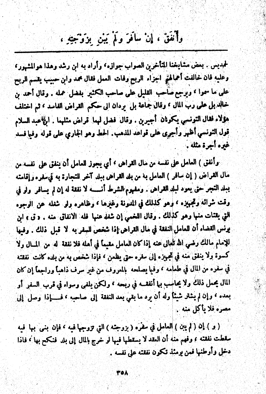 (وَ) إنْ (لَمْ يَبْنِ) الْعَامِلُ فِي سَفَرِهِ (بِزَوْجَتِهِ) الَّتِي تَزَوَّجَهَا فِيهِ، فَإِنْ بَنَى بِهَا فِيهِ سَقَطَتْ نَفَقَتُهُ، وَفُهِمَ مِنْهُ أَنَّ الْعَقْدَ لَا يُسْقِطُهَا فِيهَا لَوْ خَرَجَ بِالْمَالِ إلَى بَلَدٍ فَنَكَحَ بِهَا، فَإِذَا دَخَلَ وَأَوْطَنَهَا فَمِنْ يَوْمَئِذٍ تَكُونُ نَفَقَتُهُ عَلَى نَفْسِهِ.