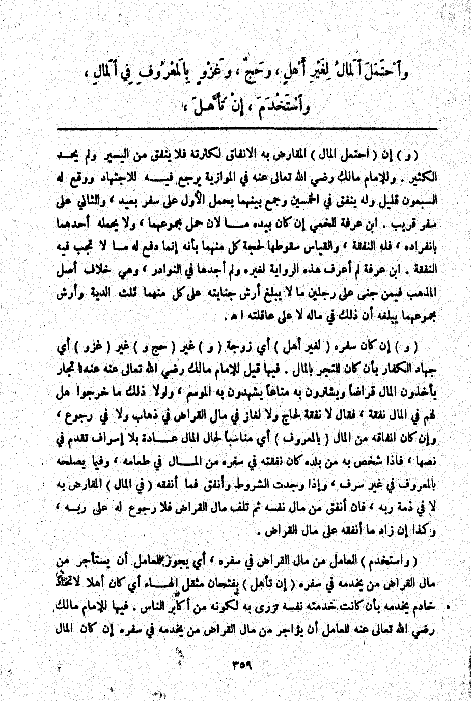 ـــــــــــــــــــــــــــــQ (وَ) إنْ (احْتَمَلَ الْمَالُ) الْمُقَارَضُ بِهِ الْإِنْفَاقَ لِكَثْرَتِهِ فَلَا يُنْفَقُ مِنْ الْيَسِيرِ وَلَمْ يُحَدَّ الْكَثِيرُ. وَلِلْإِمَامِ مَالِكٍ - رَضِيَ اللَّهُ تَعَالَى عَنْهُ - فِي الْمَوَّازِيَّةِ يُرْجَعُ فِيهِ لِلِاجْتِهَادِ وَوَقَعَ لَهُ السَّبْعُونَ قَلِيلٌ وَلَهُ يُنْفِقُ فِي الْخَمْسِينَ وَجَمَعَ بَيْنَهُمَا بِحَمْلِ الْأَوَّلِ عَلَى سَفَرٍ بَعِيدٍ، وَالثَّانِي عَلَى سَفَرٍ قَرِيبٍ. ابْنُ عَرَفَةَ لِلَّخْمِيِّ إنْ كَانَ بِيَدِهِ مَالَانِ حَمْلَ مَجْمُوعِهِمَا، وَلَا يَحْمِلُهُ أَحَدُهُمَا بِانْفِرَادِهِ، فَلَهُ النَّفَقَةُ وَالْقِيَاسُ سُقُوطُهَا لِحُجَّةِ كُلٍّ مِنْهُمَا بِأَنَّهُ إنَّمَا دَفَعَ لَهُ مَالًا تَجِبُ فِيهِ النَّفَقَةُ. ابْنُ عَرَفَةَ لَمْ أَعْرِفْ هَذِهِ الرِّوَايَةَ لِغَيْرِهِ وَلَمْ أَجِدْهَا فِي النَّوَادِرِ، وَهِيَ خِلَافُ أَصْلِ الْمَذْهَبِ فِيمَنْ جَنَى عَلَى رَجُلَيْنِ مَالًا يَبْلُغُ أَرْشَ جِنَايَتِهِ عَلَى كُلٍّ مِنْهُمَا ثُلُثَ الدِّيَةِ وَأَرْشُ مَجْمُوعِهِمَا يَبْلُغُهُ أَنَّ ذَلِكَ فِي مَالِهِ لَا عَلَى عَاقِلَتِهِ. اهـ.