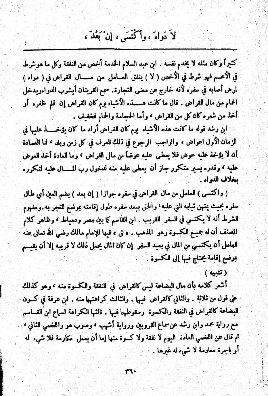 (لَا) يُنْفِقُ الْعَامِلُ مِنْ مَالِ الْقِرَاضِ فِي (دَوَاءٍ) لِمَرَضٍ أَصَابَهُ فِي سَفَرِهِ لِأَنَّهُ خَارِجٌ عَنْ مَعْنَى التِّجَارَةِ. سَمِعَ الْقَرِينَانِ أَيَشْرَبُ الدَّوَاءَ وَيَدْخُلُ الْحَمَّامَ مِنْ مَالِ الْقِرَاضِ. قَالَ مَا كَانَتْ هَذِهِ الْأَشْيَاءُ يَوْمَ كَانَ الْقِرَاضُ إنْ قَلَّمَ ظُفُرَهُ أَوْ أَخَذَ مِنْ شَعْرِهِ كَانَ كُلٌّ مِنْ الْقِرَاضِ، وَأَمَّا الْحِجَامَةُ وَالْحَمَّامُ فَخَفِيفٌ. ابْنُ رُشْدٍ قَوْلُهُ مَا كَانَتْ هَذِهِ الْأَشْيَاءُ يَوْمَ كَانَ الْقِرَاضُ أَرَادَ مَا كَانَ يُؤْخَذُ عَلَيْهَا فِي الزَّمَانِ الْأَوَّلِ أَعْوَاضٌ، وَالْوَاجِبُ الرُّجُوعُ فِي ذَلِكَ لِلْعُرْفِ فِي كُلِّ زَمَنٍ وَبَلَدٍ، فَمَا الْعَادَةُ أَنْ لَا يُؤْخَذَ عَلَيْهِ عِوَضٌ فَلَا يُعْطَى عَلَيْهِ عِوَضًا مِنْ مَالِ الْقِرَاضِ، وَمَا لِلْعَادَةِ أَخْذُ الْعِوَضِ عَلَيْهِ، وَقَدْرٌ يَسِيرٌ مُتَكَرِّرٌ جَازَ أَنْ يُعْطَى عَلَيْهِ مِنْهُ لِدُخُولِ رَبِّ الْمَالِ عَلَيْهِ لِتَكَرُّرِهِ بِخِلَافِ الدَّوَاءِ.