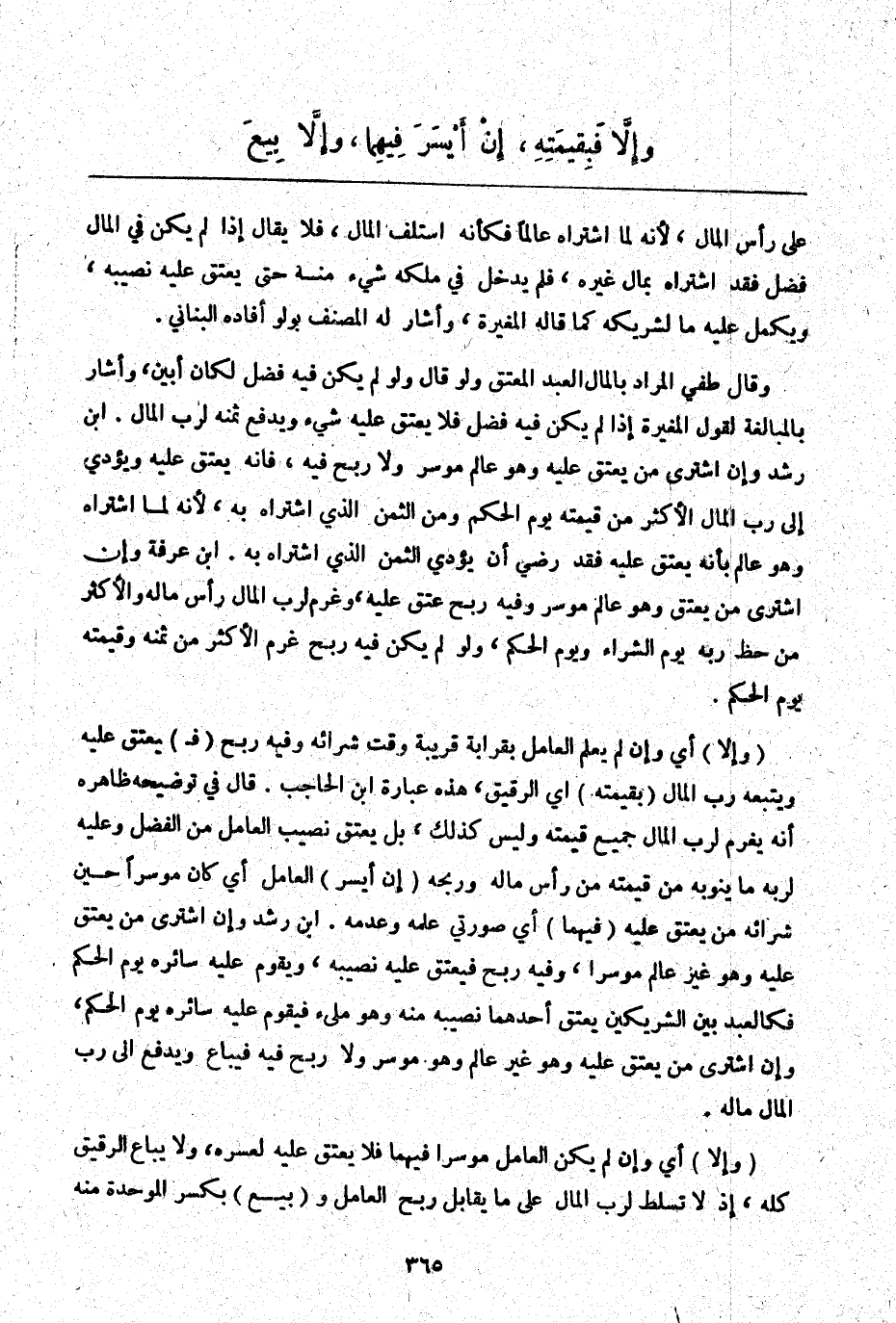 وَقَالَ طفي الْمُرَادُ بِالْمَالِ الْعَبْدُ الْمُعْتَقُ وَلَوْ قَالَ وَلَوْ لَمْ يَكُنْ فِيهِ فَضْلٌ لَكَانَ أَبْيَنَ، وَأَشَارَ بِالْمُبَالَغَةِ لِقَوْلِ الْمُغِيرَةِ إذَا لَمْ يَكُنْ فِيهِ فَضْلٌ فَلَا يَعْتِقُ عَلَيْهِ شَيْءٌ وَيَدْفَعُ ثَمَنَهُ لِرَبِّ الْمَالِ. ابْنُ رُشْدٍ وَإِنْ اشْتَرَى مَنْ يَعْتِقُ عَلَيْهِ وَهُوَ عَالِمٌ مُوسِرٌ وَلَا رِبْحَ فِيهِ، فَإِنَّهُ يَعْتِقُ عَلَيْهِ وَيُؤَدِّي إلَى رَبِّ الْمَالِ الْأَكْثَرَ مِنْ قِيمَتِهِ يَوْمَ الْحُكْمِ وَمِنْ الثَّمَنِ الَّذِي اشْتَرَاهُ بِهِ لِأَنَّهُ لَمَّا اشْتَرَاهُ وَهُوَ عَالِمٌ بِأَنَّهُ يَعْتِقُ عَلَيْهِ فَقَدْ رَضِيَ أَنْ يُؤَدِّيَ الثَّمَنَ الَّذِي اشْتَرَاهُ بِهِ. ابْنُ عَرَفَةَ وَإِنْ اشْتَرَى مَنْ يَعْتِقُ وَهُوَ عَالِمٌ مُوسِرٌ وَفِيهِ رِبْحٌ عَتَقَ عَلَيْهِ، وَغَرِمَ لِرَبِّ الْمَالِ رَأْسَ مَالِهِ وَالْأَكْثَرَ مِنْ حَظِّ رَبِّهِ يَوْمَ الشِّرَاءِ وَيَوْمَ الْحُكْمِ، وَلَوْ لَمْ يَكُنْ فِيهِ رِبْحٌ غَرِمَ الْأَكْثَرَ مِنْ ثَمَنِهِ وَقِيمَتِهِ يَوْمَ الْحُكْمِ.