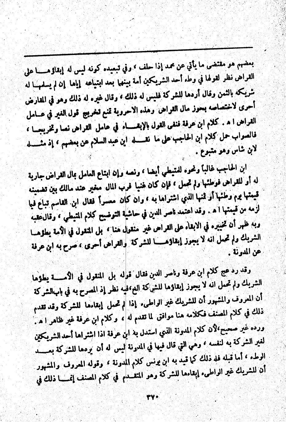 ـــــــــــــــــــــــــــــQبَعْضِهِمْ هُوَ مُقْتَضَى مَا يَأْتِي عَنْ مُحَمَّدٍ إذَا حَلَّفَهُ، وَفِي تَبْعِيدِهِ كَوْنُهُ لَيْسَ بِهِ إبْقَاؤُهَا عَلَى الْقِرَاضِ نَظَرٌ لِقَوْلِهَا فِي وَطْءِ أَحَدِ الشَّرِيكَيْنِ أَمَةً بَيْنَهُمَا بَعْدَ ابْتِيَاعِهِ إيَّاهَا إنْ لَمْ يُسَلِّمْهَا لَهُ شَرِيكُهُ بِالثَّمَنِ وَقَالَ أَرُدُّهَا لِلشَّرِكَةِ فَلَيْسَ لَهُ ذَلِكَ، وَقَالَ غَيْرُهُ لَهُ ذَلِكَ وَهُوَ فِي الْمُقَارَضِ أَحْرَى لِاخْتِصَاصِهِ بِحَوْزِ مَالِ الْقِرَاضِ وَهَذِهِ الْأَحْرَوِيَّةُ تَمْنَعُ تَخْرِيجَ قَوْلِ الْغَيْرِ فِي عَامِلِ الْقِرَاضِ. اهـ. كَلَامُ ابْنِ عَرَفَةَ فَنَفَى الْقَوْلَ بِالْإِبْقَاءِ فِي عَامِلِ الْقِرَاضِ نَصًّا وَتَخْرِيجًا فَالصَّوَابُ حَمْلُ كَلَامِ ابْنِ الْحَاجِبِ عَلَى مَا نَقَلَهُ ابْنُ عَبْدِ السَّلَامِ عَنْ بَعْضِهِمْ، إذْ مِثْلُهُ لِابْنِ شَاسٍ وَهُوَ مَتْبُوعٌ.