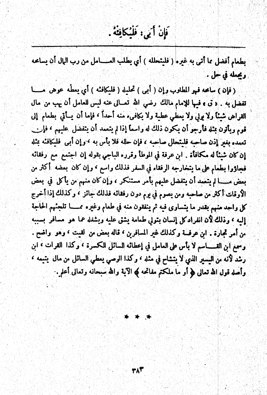 (فَإِنْ) سَامَحَهُ فَهُوَ الْمَطْلُوبُ وَإِنْ (أَبَى) تَحْلِيلَهُ (فَلْيُكَافِئْهُ) أَيْ يُعْطِهِ عِوَضَ مَا تَفَضَّلَ بِهِ. " ق " فِيهَا لِلْإِمَامِ مَالِكٍ - رَضِيَ اللَّهُ تَعَالَى عَنْهُ - لَيْسَ لِلْعَامِلِ أَنْ يَهَبَ مِنْ مَالِ الْقِرَاضِ شَيْئًا وَلَا يُوَلِّي وَلَا يُعْطِي عَطِيَّةً وَلَا يُكَافِئُ مِنْهُ أَحَدًا، فَأَمَّا أَنْ يَأْتِيَ بِطَعَامٍ إلَى قَوْمٍ وَيَأْتُونَ بِمِثْلِهِ فَأَرْجُو أَنْ يَكُونَ ذَلِكَ لَهُ وَاسِعًا إذَا لَمْ يَتَعَمَّدْ أَنْ يَتَفَضَّلَ عَلَيْهِمْ، فَإِنْ تَعَمَّدَهُ بِغَيْرِ إذْنِ صَاحِبِهِ فَلْيَتَحَلَّلْ صَاحِبَهُ، فَإِنْ حَلَّلَهُ فَلَا بَأْسَ بِهِ، وَإِنْ أَبَى فَلْيُكَافِئْهُ بِمِثْلِهِ إنْ كَانَ شَيْئًا لَهُ مُكَافَأَةٌ. ابْنُ عَرَفَةَ فِي الْمُوَطَّإِ وَقَرَّرَهُ الْبَاجِيَّ بِقَوْلِهِ إنْ اجْتَمَعَ مَعَ رُفَقَائِهِ فَجَاءُوا بِطَعَامٍ عَلَى مَا يَتَخَارَجُهُ الرُّفَقَاءُ فِي السَّفَرِ فَذَلِكَ وَاسِعٌ، وَإِنْ كَانَ بَعْضُهُ أَكْثَرَ مِنْ بَعْضٍ مَا لَمْ يَتَعَمَّدْ أَنْ يَتَفَضَّلَ عَلَيْهِمْ بِأَمْرٍ مُسْتَنْكَرٍ، وَإِنْ كَانَ مِنْهُمْ مَنْ يَأْكُلُ فِي بَعْضِ الْأَوْقَاتِ أَكْثَرَ مِنْ صَاحِبِهِ وَمَنْ يَصُومُ فِي يَوْمٍ دُونَ رُفَقَائِهِ فَذَلِكَ جَائِزٌ وَكَذَلِكَ إذَا أَخْرَجَ كُلُّ وَاحِدٍ مِنْهُمْ بِقَدْرِ مَا يُتَسَاوَى فِيهِ ثُمَّ يُنْفِقُونَ مِنْهُ فِي طَعَامٍ وَغَيْرِهِ مِمَّا تُلْجِئُهُمْ الْحَاجَةُ إلَيْهِ، وَذَلِكَ لِأَنَّ انْفِرَادَ كُلِّ إنْسَانٍ بِتَوَلِّي طَعَامِهِ يَشُقُّ عَلَيْهِ، وَيُشْغِلُهُ عَمَّا هُوَ مُسَافِرٌ بِسَبَبِهِ مِنْ أَمْرِ تِجَارَةٍ. ابْنُ عَرَفَةَ وَكَذَلِكَ غَيْرُ الْمُسَافِرِينَ، قَالَهُ بَعْضُ مَنْ لَقِيت، وَهُوَ وَاضِحٌ. وَسَمِعَ ابْنُ الْقَاسِمِ لَا بَأْسَ عَلَى الْعَامِلِ فِي إعْطَائِهِ السَّائِلَ الْكِسْرَةَ وَكَذَا الْقُرَّاتُ ابْنُ رُشْدٍ لِأَنَّهُ مِنْ الْيَسِيرِ الَّذِي لَا يُتَشَاحُّ فِي مِثْلِهِ وَكَذَا الْوَصِيُّ يُعْطِي السَّائِلَ مِنْ مَالِ يَتِيمِهِ، وَأَصْلُهُ قَوْلُ اللَّهِ تَعَالَى {أَوْ مَا مَلَكْتُمْ مَفَاتِحَهُ} [النور: 61] الْآيَةَ، وَاَللَّهُ سُبْحَانَهُ وَتَعَالَى أَعْلَمُ.