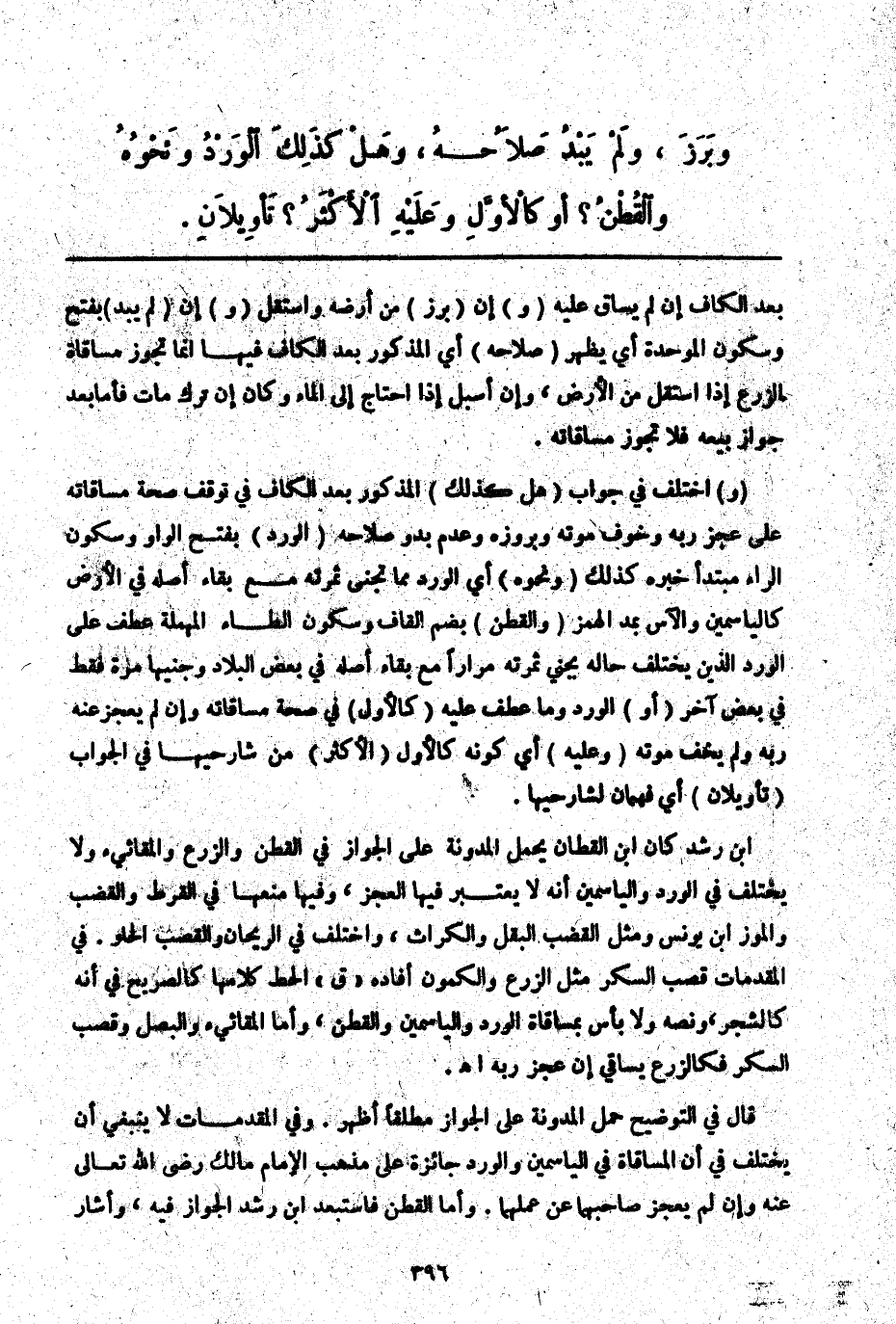 (وَ) اُخْتُلِفَ فِي جَوَابِ (هَلْ كَذَلِكَ) الْمَذْكُورُ بَعْدَ الْكَافِ فِي تَوَقُّفِ صِحَّةِ مُسَاقَاتِهِ عَلَى عَجْزِ رَبِّهِ وَخَوْفِ مَوْتِهِ وَبُرُوزِهِ وَعَدَمِ بُدُوِّ صَلَاحِهِ (الْوَرْدُ) بِفَتْحِ الْوَاوِ وَسُكُونِ الرَّاءِ مُبْتَدَأٌ خَبَرُهُ كَذَلِكَ (وَنَحْوُهُ) أَيْ الْوَرْدُ مِمَّا تُجْنَى ثَمَرَتُهُ مَعَ بَقَاءِ أَصْلِهِ فِي الْأَرْضِ كَالْيَاسَمِينِ وَالْآسِ بِمَدِّ الْهَمْزِ (وَالْقُطْنُ) بِضَمِّ الْقَافِ وَسُكُونِ الطَّاءِ الْمُهْمَلَةِ عُطِفَ عَلَى الْوَرْدِ الَّذِي يَخْتَلِفُ حَالُهُ بِجَنْيِ ثَمَرَتِهِ مِرَارًا مَعَ بَقَاءِ أَصْلِهِ فِي بَعْضِ الْبِلَادِ وَجَنْيِهَا مَرَّةً فَقَطْ فِي بَعْضٍ آخَرَ (أَوْ) الْوَرْدُ وَمَا عُطِفَ عَلَيْهِ (كَالْأَوَّلِ) فِي صِحَّةِ مُسَاقَاتِهِ وَإِنْ لَمْ يَعْجِزْ عَنْهُ رَبُّهُ وَلَمْ يَخَفْ مَوْتَهُ (وَعَلَيْهِ) أَيْ كَوْنُهُ كَالْأَوَّلِ (الْأَكْثَرُ) مِنْ شَارِحِيهَا فِي الْجَوَابِ (تَأْوِيلَانِ) أَيْ يُفْهِمَانِ لِشَارِحَيْهَا. ابْنُ رُشْدٍ كَانَ ابْنُ الْقَطَّانِ يَحْمِلُ الْمُدَوَّنَةَ عَلَى الْجَوَازِ فِي الْقُطْنِ وَالزَّرْعِ والمقاثئ وَلَا يُخْتَلَفُ فِي الْوَرْدِ وَالْيَاسَمِينِ أَنَّهُ لَا يُعْتَبَرُ فِيهَا الْعَجْزُ، وَفِيهَا مَنْعُهَا فِي الْقُرْطِ وَالْقَضْبِ وَالْمَوْزِ ابْنُ يُونُسَ وَمِثْلُ الْقَضْبِ الْبَقْلُ وَالْكُرَّاثُ، وَاخْتُلِفَ فِي الرَّيْحَانِ وَالْقَصَبِ الْحُلْوِ. فِي الْمُقَدِّمَاتِ قَصَبُ السُّكَّرِ مِثْلُ الزَّرْعِ وَالْكَمُّونِ أَفَادَهُ " ق " الْحَطّ كَلَامُهَا كَالصَّرِيحِ فِي أَنَّهُ كَالشَّجَرِ، وَنَصُّهُ وَلَا بَأْسَ بِمُسَاقَاةِ الْوَرْدِ وَالْيَاسَمِينِ وَالْقُطْنِ، وَأَمَّا المقاثئ وَالْبَصَلُ وَقَصَبُ السُّكَّرِ فَكَالزَّرْعِ يُسَاقَى إنْ عَجَزَ رَبُّهُ اهـ. قَالَ فِي التَّوْضِيحِ حَمْلُ الْمُدَوَّنَةَ عَلَى الْجَوَازِ مُطْلَقًا أَظْهَرُ. وَفِي الْمُقَدِّمَاتِ لَا يَنْبَغِي أَنْ يُخْتَلَفَ فِي أَنَّ الْمُسَاقَاةَ فِي الْيَاسَمِينِ وَالْوَرْدِ جَائِزَةٌ عَلَى مَذْهَبِ الْإِمَامِ مَالِكٍ - رَضِيَ اللَّهُ تَعَالَى عَنْهُ - وَإِنْ لَمْ يَعْجِزْ صَاحِبُهُمَا عَنْ عَمَلِهِمَا. وَأَمَّا الْقُطْنُ فَاسْتَبْعَدَ ابْنُ رُشْدٍ الْجَوَازَ فِيهِ، وَأَشَارَ