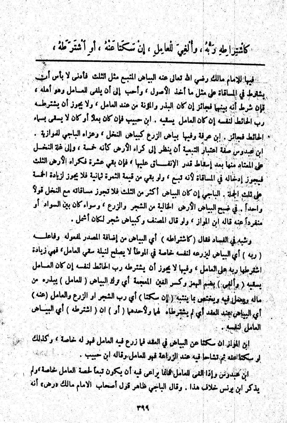ـــــــــــــــــــــــــــــQفِيهَا لِلْإِمَامِ مَالِكٍ - رَضِيَ اللَّهُ تَعَالَى عَنْهُ - الْبَيَاضُ الْمُتَّبَعُ مِثْلُ الثُّلُثِ فَأَدْنَى لَا بَأْسَ أَنْ يَشْتَرِطَ فِي الْمُسَاقَاةِ عَلَى مِثْلِ مَا أَخَذَ الْأُصُولُ، وَأَحَبُّ إلَيَّ أَنْ يُلْغَى لِلْعَامِلِ وَهُوَ أَهْلُهُ، فَإِنْ شَرَطَ أَنَّهُ بَيْنَهُمَا فَجَائِزٌ إنْ كَانَ الْبَذْرُ وَالْمُؤْنَةُ مِنْ عِنْدِ الْعَامِلِ، وَلَا يَجُوزُ أَنْ يَشْتَرِطَهُ رَبُّ الْحَائِطِ لِنَفْسِهِ إنْ كَانَ الْعَامِلُ يَسْقِيهِ. ابْنُ حَبِيبٍ فَإِنْ كَانَ بَعْلًا أَوْ كَانَ لَا يُسْقَى بِمَاءِ الْحَائِطِ فَجَائِزٌ. ابْنُ عَرَفَةَ وَفِيهَا بَيَاضُ الزَّرْعِ كَبَيَاضِ النَّخْلِ، وَعَزَاهُ الْبَاجِيَّ لِلْمَوَّازِيَّةِ. ابْنُ عَبْدُوسٍ صِفَةُ اعْتِبَارِ التَّبَعِيَّةِ أَنْ يَنْظُرَ إلَى كِرَاءِ الْأَرْضِ كَأَنَّهُ خَمْسَةٌ، وَإِلَى غَلَّةِ النَّخْلِ عَلَى الْمُعْتَادِ مِنْهَا بَعْدَ إسْقَاطِ قَدْرِ الْإِنْفَاقِ عَلَيْهَا، فَإِنْ بَقِيَ عَشَرَةٌ فَكِرَاءُ الْأَرْضِ الثُّلُثُ فَيَجُوزُ إدْخَالُهُ فِي الْمُسَاقَاةِ لِأَنَّهُ تَبَعٌ، وَلَوْ بَقِيَ مِنْ قِيمَةِ الثَّمَرَةِ ثَمَانِيَةٌ فَلَا يَجُوزُ لِزِيَادَةِ الْخَمْسَةِ عَلَى ثُلُثِ الْجُمْلَةِ. الْبَاجِيَّ إنْ كَانَ الْبَيَاضُ أَكْثَرَ مِنْ الثُّلُثِ فَلَا تَجُوزُ مُسَاقَاتُهُ مَعَ النَّخْلِ قَوْلًا وَاحِدًا. فِي ضَيْح الْبَيَاضُ الْأَرْضُ الْخَالِيَةُ مِنْ الشَّجَرِ وَالزَّرْعِ، وَسَوَاءٌ كَانَ بَيْنَ السَّوَادِ أَوْ مُنْفَرِدًا عَنْهُ قَالَهُ ابْنُ الْمَوَّازِ، وَلَوْ قَالَ الْمُصَنِّفُ وَكَبَيَاضِ شَجَرٍ لِكُلٍّ أَشْمَلَ.