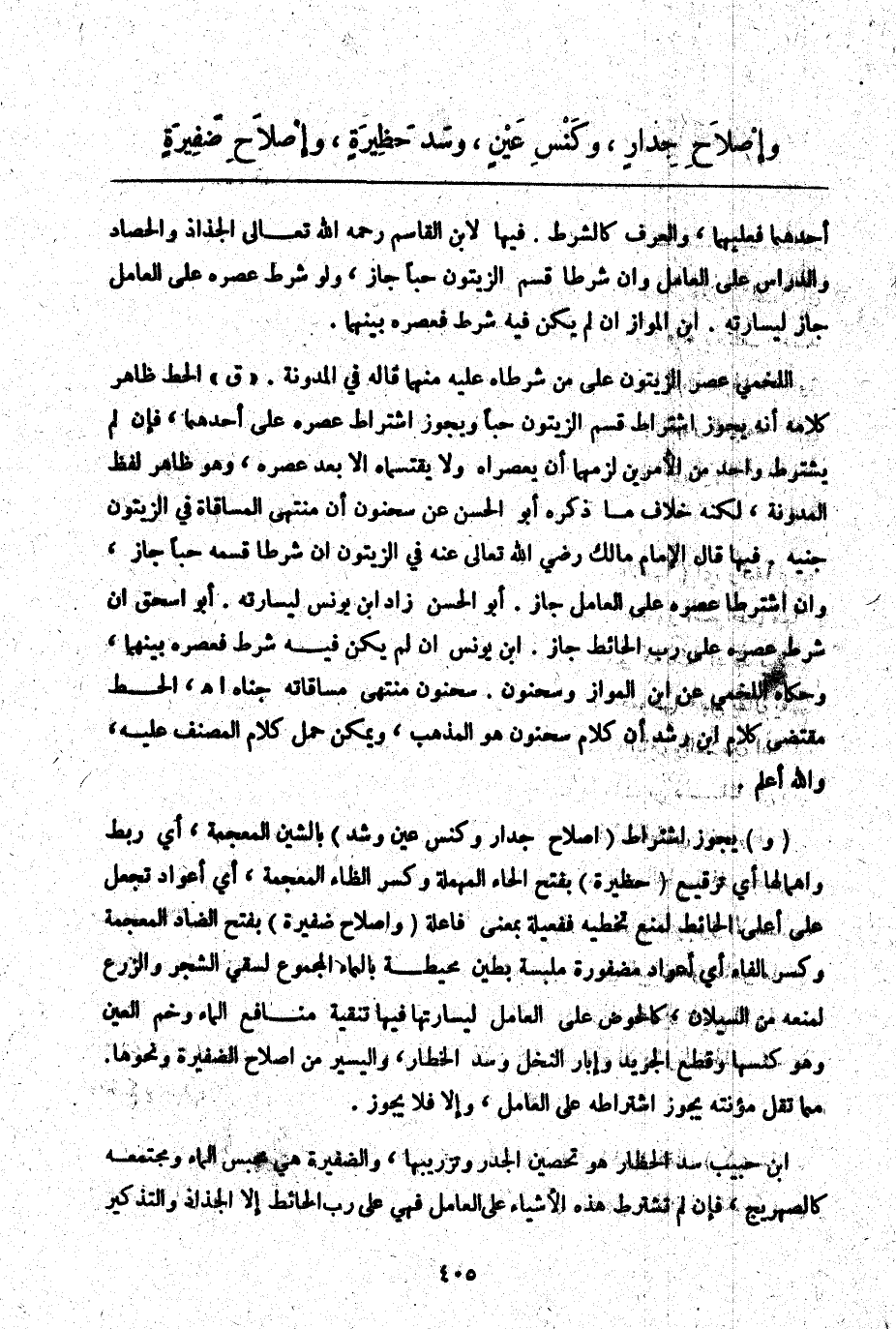 (وَ) يَجُوزُ اشْتِرَاطُ (إصْلَاحِ جِدَارٍ وَكَنْسِ عَيْنٍ وَشَدٍّ) بِالشِّينِ الْمُعْجَمَةِ، أَيْ رَبْطٌ وَإِهْمَالُهَا أَيْ تَرْقِيعُ (حَظِيرَةٍ) بِفَتْحِ الْحَاءِ الْمُهْمَلَةِ وَكَسْرِ الظَّاءِ الْمُعْجَمَةِ، أَيْ أَعْوَادٌ تُجْعَلُ عَلَى أَعْلَى الْحَائِطِ لِمَنْعِ تَخَطِّيهِ فَفَعِيلَةٌ بِمَعْنَى فَاعِلَةٍ (وَإِصْلَاحُ ضَفِيرَةٍ) بِفَتْحِ الضَّادِ الْمُعْجَمَةِ وَكَسْرِ الْفَاءِ أَيْ أَعْوَادٌ مَضْفُورَةٌ مُلْبِسَةٌ بِطِينٍ مُحِيطَةٌ بِالْمَاءِ الْمَجْمُوعِ لِسَقْيِ الشَّجَرِ وَالزَّرْعِ لِمَنْعِهِ مِنْ السَّيَلَانِ كَالْحَوْضِ عَلَى الْعَامِلِ لِيَسَارَتِهَا فِيهَا تَنْقِيَةُ مَنَافِعِ الْمَاءِ وَخَمِّ الْعَيْنِ وَهُوَ كَنْسُهَا وَقَطْعُ الْجَرِيدِ وَإِبَارُ النَّخْلِ وَسَدُّ الْحِظَارِ، وَالْيَسِيرُ مِنْ إصْلَاحِ الضَّفِيرَةِ وَنَحْوِهَا. مِمَّا تَقِلُّ مُؤْنَتُهُ يَجُوزُ اشْتِرَاطُهُ عَلَى الْعَامِلِ، وَإِلَّا فَلَا يَجُوزُ. ابْنُ حَبِيبٍ سَدُّ الْحِظَارِ هُوَ تَحْصِينُ الْجُدُرِ وَتَزْرِيبُهَا، وَالضَّفِيرَةُ هِيَ مَحْبِسُ الْمَاءِ وَمُجْتَمَعُهُ كَالصِّهْرِيجِ، فَإِنْ لَمْ تُشْتَرَطْ هَذِهِ الْأَشْيَاءُ عَلَى الْعَامِلِ فَهِيَ عَلَى رَبِّ الْحَائِطِ إلَّا الْجَذَاذُ وَالتَّذْكِيرُ