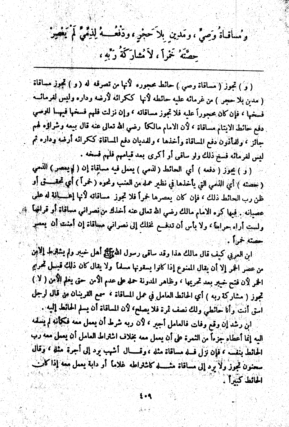ـــــــــــــــــــــــــــــQوَ) تَجُوزُ (مُسَاقَاةُ وَصِيٍّ) حَائِطَ مَحْجُورِهِ لِأَنَّهَا مِنْ تَصَرُّفِهِ لَهُ (وَ) تَجُوزُ مُسَاقَاةُ (مَدِينٍ بِلَا حَجْرٍ) مِنْ غُرَمَائِهِ عَلَيْهِ حَائِطُهُ لِأَنَّهَا كَكِرَائِهِ لِأَرْضِهِ وَدَارِهِ وَلَيْسَ لِغُرَمَائِهِ فَسْخُهَا، فَإِنْ كَانَ مَحْجُورًا عَلَيْهِ فَلَا تَجُوزُ مُسَاقَاتُهُ، وَإِنْ نَزَلَتْ فَلَهُمْ فَسْخُهَا فِيهَا لِلْوَصِيِّ دَفْعُ حَائِطِ الْأَيْتَامِ مُسَاقَاةً، لِأَنَّ الْإِمَامَ مَالِكًا - رَضِيَ اللَّهُ تَعَالَى عَنْهُ - قَالَ بَيْعُهُ وَشِرَاؤُهُ لَهُمْ جَائِزٌ، وَلِلْمَأْذُونِ دَفْعُ الْمُسَاقَاةِ وَأَخْذُهَا، وَلِلْمِدْيَانِ دَفْعُ الْمُسَاقَاةِ كَكِرَائِهِ أَرْضَهُ وَدَارَهُ ثُمَّ لَيْسَ لِغُرَمَائِهِ فَسْخُ ذَلِكَ وَلَوْ سَاقَى أَوْ أَكْرَى بَعْدَ قِيَامِهِمْ فَلَهُمْ فَسْخُهُ.