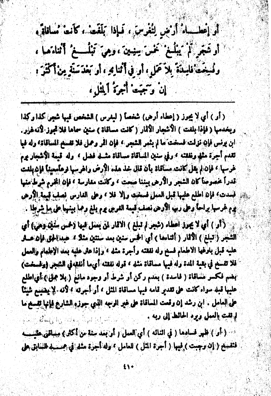 (وَفُسِخَتْ) بِضَمٍّ فَكَسْرٍ مُسَاقَاةٌ (فَاسِدَةً) بِعَدَمِ رُكْنٍ أَوْ شَرْطٍ أَوْ وُجُودِ مَانِعٍ (بِلَا عَمَلٍ) أَيْ اطَّلَعَ عَلَيْهَا قَبْلَهُ سَوَاءٌ كَانَتْ عَلَى تَقْدِيرِ تَمَامِهِ فِيهَا مُسَاقَاةَ الْمِثْلِ، أَوْ أُجْرَتُهُ لِأَنَّهُ لَا يُضَيِّعُ شَيْئًا عَلَى الْعَامِلِ. ابْنُ رُشْدٍ إنْ وَقَعَتْ الْمُسَاقَاةُ عَلَى غَيْرِ الْوَجْهِ الَّذِي جَوَّزَهُ الشَّارِعُ فَإِنَّهَا تُفْسَخُ مَا لَمْ تَفُتْ بِالْعَمَلِ وَيُرَدُّ الْحَائِطُ إلَى رَبِّهِ.