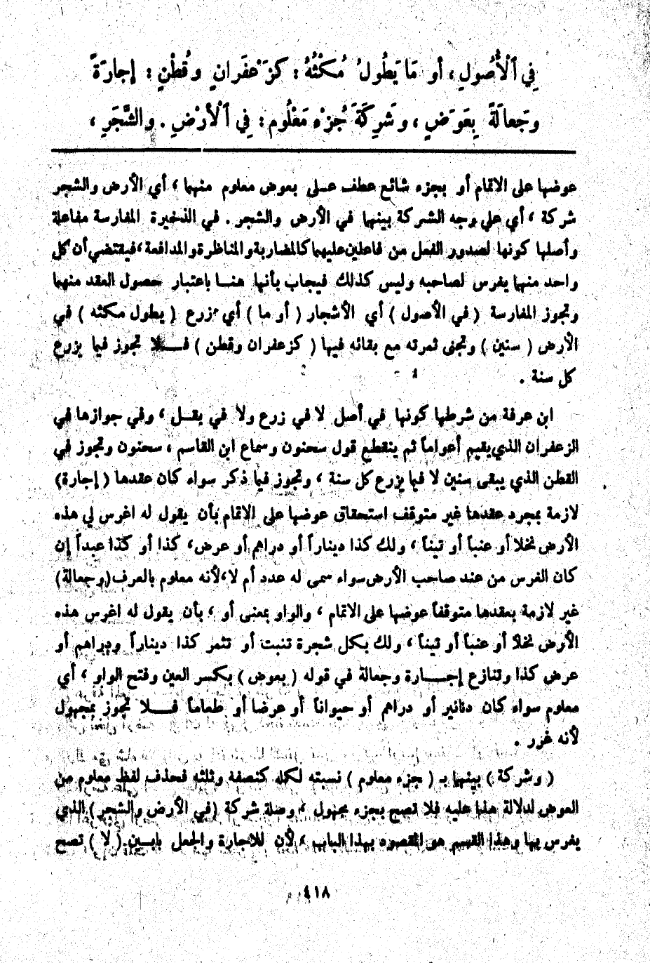 فِي الْأُصُولِ، أَوْ مَا يَطُولُ مُكْثُهُ: كَزَعْفَرَانٍ وَقُطْنٍ: إجَارَةً وَجَعَالَةً بِعِوَضٍ