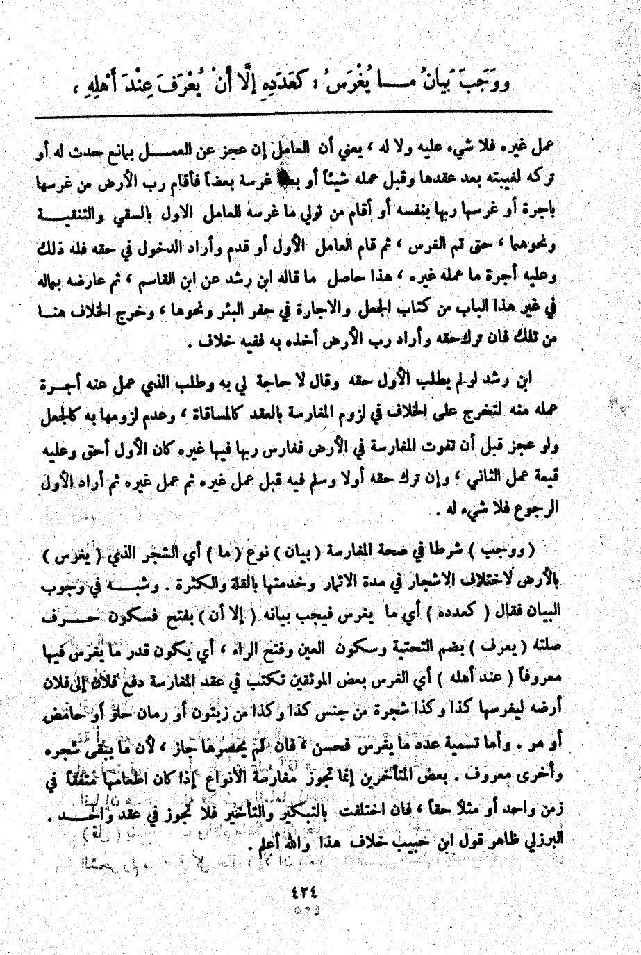 (وَوَجَبَ) شَرْطًا فِي صِحَّةِ الْمُغَارَسَةِ (بَيَانُ) نَوْعِ (مَا) أَيْ الشَّجَرِ الَّذِي (يُغْرَسُ) بِالْأَرْضِ لِاخْتِلَافِ الْأَشْجَارِ فِي مُدَّةِ الْإِثْمَارِ وَخِدْمَتِهَا بِالْقِلَّةِ وَالْكَثْرَةِ. وَشَبَّهَ فِي وُجُوبِ الْبَيَانِ فَقَالَ (كَعَدَدِهِ) أَيْ مَا يُغْرَسُ فَيَجِبُ بَيَانُهُ (إلَّا أَنْ) بِفَتْحٍ فَسُكُونٍ حَرْفٌ صِلَتُهُ (يُعْرَفُ) بِضَمِّ التَّحْتِيَّةِ وَسُكُونِ الْعَيْنِ وَفَتْحِ الرَّاءِ، أَيْ يَكُونُ قَدْرَ مَا يُغْرَسُ فِيهَا مَعْرُوفًا (عِنْدَ أَهْلِهِ) أَيْ الْغَرْسَ بَعْضُ الْمُوثَقِينَ تُكْتَبُ فِي عَقْدِ الْمُغَارَسَةِ دَفَعَ فُلَانٌ إلَى فُلَانٍ أَرْضَهُ لِيَغْرِسَهَا كَذَا وَكَذَا شَجَرَةً مِنْ جِنْسِ كَذَا وَكَذَا مِنْ زَيْتُونٍ أَوْ رُمَّانٍ حُلْوٍ أَوْ حَامِضٍ أَوْ مُرٍّ. وَأَمَّا تَسْمِيَةُ عَدَدِ مَا يُغْرَسُ فَحَسَنٌ، فَإِنْ لَمْ يَحْصُرْهَا جَازَ لِأَنَّ مَا يَبْقَى شَجَرُهُ وَأُخْرَى مَعْرُوفٌ. بَعْضُ الْمُتَأَخِّرِينَ إنَّمَا تَجُوزُ مُغَارَسَةُ الْأَنْوَاعِ إذَا كَانَ إطْعَامُهَا مُتَّفِقًا فِي زَمَنٍ وَاحِدٍ أَوْ مَثَلًا حَقًّا، فَإِنْ اخْتَلَفَتْ بِالتَّبْكِيرِ وَالتَّأْخِيرِ فَلَا تَجُوزُ فِي عَقْدٍ وَاحِدٍ. الْبُرْزُلِيُّ ظَاهِرُ قَوْلِ ابْنِ حَبِيبٍ خِلَافُ هَذَا وَاَللَّهُ أَعْلَمُ.