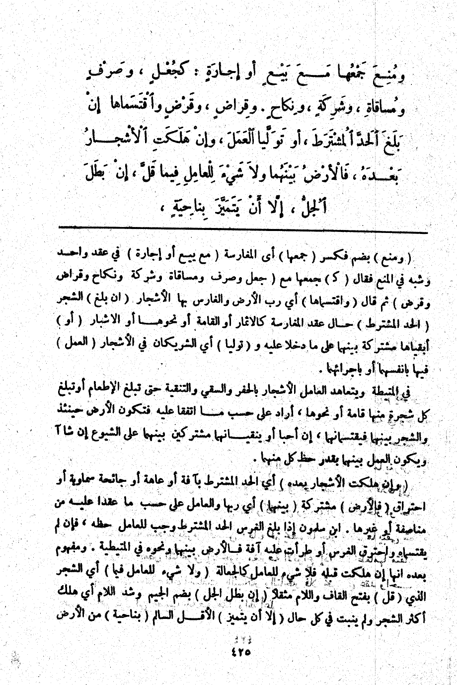 ـــــــــــــــــــــــــــــQوَمُنِعَ) بِضَمٍّ فَكَسْرٍ (جَمْعُهَا) أَيْ الْمُغَارَسَةُ (مَعَ بَيْعٍ أَوْ إجَارَةٍ) فِي عَقْدٍ وَاحِدٍ وَشَبَّهَ فِي الْمَنْعِ فَقَالَ (كَ) جَمْعِهَا مَعَ (جُعْلٍ وَصَرْفٍ وَمُسَاقَاةٍ وَشَرِكَةٍ وَنِكَاحٍ وَقِرَاضٍ وَقَرْضٍ) ثُمَّ قَالَ (وَاقْتَسَمَاهَا) أَيْ رَبُّ الْأَرْضِ وَالْغَارِسُ بِهَا الْأَشْجَارَ (إنْ بَلَغَ) الشَّجَرُ (الْحَدَّ الْمُشْتَرَطَ) حَالَ عَقْدِ الْمُغَارَسَةِ كَالْإِثْمَارِ أَوْ الْقَامَةِ أَوْ نَحْوِهَا أَوْ الْأَشْبَارِ (أَوْ) أَبْقَيَاهَا مُشْتَرَكَةً بَيْنَهُمَا عَلَى مَا دَخَلَا عَلَيْهِ وَ (تَوَلَّيَا) أَيْ الشَّرِيكَانِ فِي الْأَشْجَارِ (الْعَمَلَ) فِيهَا بِأَنْفُسِهِمَا أَوْ بِأُجَرَائِهِمَا. فِي الْمُتَيْطِيَّةِ وَيَتَعَاهَدُ الْعَامِلُ الْأَشْجَارَ بِالْحَفْرِ وَالسَّقْيِ وَالتَّنْقِيَةِ حَتَّى تَبْلُغَ الْإِطْعَامَ أَوْ تَبْلُغَ كُلُّ شَجَرَةٍ مِنْهَا قَامَةً أَوْ نَحْوَهَا، أَرَادَ عَلَى حَسَبِ مَا اتَّفَقَا عَلَيْهِ فَتَكُونُ الْأَرْضُ حِينَئِذٍ وَالشَّجَرُ بَيْنَهُمَا فَيَقْتَسِمَانِهِمْ ا، إنْ أَحَبَّا أَوْ يُنَقِّيَانِهِمَا مُشْتَرَكَيْنِ بَيْنَهُمَا عَلَى الشُّيُوعِ إنْ شَاءَا وَيَكُونُ الْعَمَلُ بَيْنَهُمَا بِقَدْرِ حَظِّ كُلٍّ مِنْهُمَا