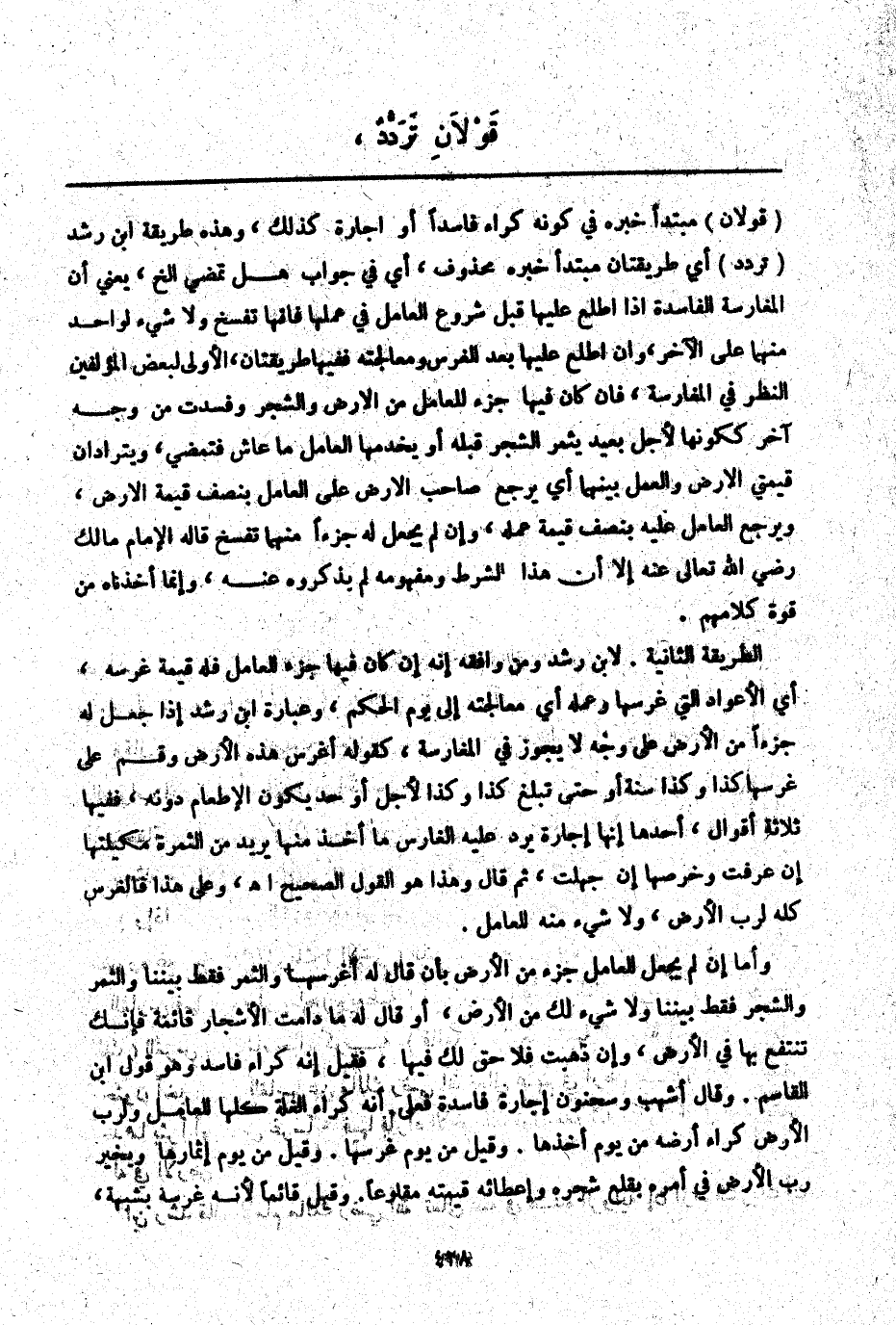 ـــــــــــــــــــــــــــــQ (قَوْلَانِ) مُبْتَدَأٌ خَبَرُهُ فِي كَوْنِهِ كِرَاءً فَاسِدًا أَوْ إجَارَةً كَذَلِكَ، وَهَذِهِ طَرِيقَةُ ابْنِ رُشْدٍ (تَرَدُّدٌ) أَيْ طَرِيقَتَانِ مُبْتَدَأٌ خَبَرُهُ مَحْذُوفٌ، أَيْ فِي جَوَابِ هَلْ تَمْضِي إلَخْ، يَعْنِي أَنَّ الْمُغَارَسَةَ الْفَاسِدَةَ إذَا اطَّلَعَ عَلَيْهَا قَبْلَ شُرُوعِ الْعَامِلِ فِي عَمَلِهَا فَإِنَّهَا تُفْسَخُ وَلَا شَيْءَ لِوَاحِدٍ مِنْهُمَا عَلَى الْآخَرِ، وَإِنْ اطَّلَعَ عَلَيْهَا بَعْدَ الْغَرْسِ وَمُعَالَجَتِهِ فَفِيهَا طَرِيقَتَانِ، الْأُولَى لِبَعْضِ الْمُؤَلِّفِينَ النَّظَرُ فِي الْمُغَارَسَةِ، فَإِنْ كَانَ فِيهَا جُزْءٌ لِلْعَامِلِ مِنْ الْأَرْضِ وَالشَّجَرِ وَفَسَدَتْ مِنْ وَجْهٍ آخَرَ كَكَوْنِهَا لِأَجَلٍ بَعِيدٍ يُثْمِرُ الشَّجَرُ قَبْلَهُ أَوْ يَخْدُمُهَا الْعَامِلُ مَا عَاشَ فَتَمْضِي، وَيَتَرَادَّانِ قِيمَتَيْ الْأَرْضِ وَالْعَمَلِ بَيْنَهُمَا أَيْ يَرْجِعُ صَاحِبُ الْأَرْضِ عَلَى الْعَامِلِ بِنِصْفِ قِيمَةِ الْأَرْضِ، وَيَرْجِعُ الْعَامِلُ عَلَيْهِ بِنِصْفِ قِيمَةِ عَمَلِهِ، وَإِنْ لَمْ يَجْعَلْ لَهُ جُزْءًا مِنْهُمَا تُفْسَخُ قَالَهُ الْإِمَامُ مَالِكٌ - رَضِيَ اللَّهُ تَعَالَى عَنْهُ - إلَّا أَنَّ هَذَا الشَّرْطَ وَمَفْهُومُهُ لَمْ يَذْكُرُوهُ عَنْهُ، وَإِنَّمَا أَخَذْنَاهُ مِنْ قُوَّةِ كَلَامِهِمْ.