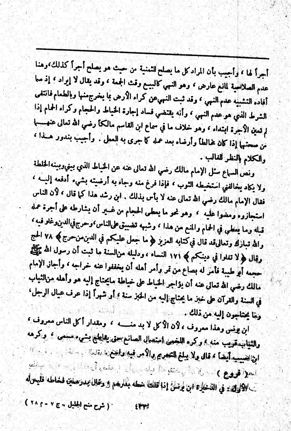 ـــــــــــــــــــــــــــــQأَجْرًا لَهَا، وَأُجِيبَ بِأَنَّ الْمُرَادَ كُلُّ مَا يَصْلُحُ لِلثَّمَنِيَّةِ مِنْ حَيْثُ هُوَ يَصْلُحُ أَجْرًا كَذَلِكَ، وَهُنَا عَدَمُ الصَّلَاحِيَّةِ لِمَانِعٍ عَارِضٍ، وَهُوَ النَّهْيُ كَالْبَيْعِ وَقْتَ الْجُمُعَةِ، وَقَدْ يُقَالُ لَا إيرَادَ، إذْ مِمَّا أَفَادَهُ التَّشْبِيهُ عَدَمَ النَّهْيِ، وَقَدْ ثَبَتَ النَّهْيُ عَنْ كِرَاءِ الْأَرْضِ بِمَا يَخْرُجُ مِنْهَا وَبِالطَّعَامِ فَانْتَفَى الشَّرْطُ الَّذِي هُوَ عَدَمُ النَّهْيِ، وَأَنَّهُ يَقْتَضِي فَسَادَ إجَارَةِ الْخَيَّاطِ وَالْحَجَّامِ وَكِرَاءِ الْحَمَّامِ إذَا لَمْ تُعَيَّنْ الْأُجْرَةُ ابْتِدَاءً، وَهُوَ خِلَافُ مَا فِي سَمَاعِ ابْنِ الْقَاسِمِ مَالِكًا - رَضِيَ اللَّهُ تَعَالَى عَنْهُمَا - مِنْ صِحَّتِهِمَا إذَا كَانَ مُخَالِطًا وَأَرْضَاهُ بَعْدَ عَمَلِهِ كَمَا جَرَى بِهِ الْعَمَلُ. وَأُجِيبَ بِنُدُورِ هَذَا، وَالْكَلَامُ بِالنَّظَرِ لِلْغَالِبِ. وَنَصُّ السَّمَاعِ سُئِلَ الْإِمَام مَالِكٌ - رَضِيَ اللَّهُ تَعَالَى عَنْهُ - عَنْ الْخَيَّاطِ الَّذِي بَيْنِي وَبَيْنَهُ الْخُلْطَةُ وَلَا يَكَادُ يُخَالِفُنِي أَسْتَخِيطُهُ الثَّوْبَ، فَإِذَا فَرَغَ مِنْهُ وَجَاءَ بِهِ أَرْضَيْته بِشَيْءٍ أَدْفَعُهُ إلَيْهِ، فَقَالَ الْإِمَامُ مَالِكٌ - رَضِيَ اللَّهُ تَعَالَى عَنْهُ - لَا بَأْسَ بِذَلِكَ. ابْنُ رُشْدٍ هَذَا كَمَا قَالَ لِأَنَّ النَّاسَ اسْتَجَازُوهُ وَمَضَوْا عَلَيْهِ، وَهُوَ نَحْوُ مَا يُعْطَى الْحَجَّامُ مِنْ غَيْرِ أَنْ يُشَارِطَهُ عَلَى أُجْرَةِ عَمَلِهِ قَبْلَهُ وَمَا يُعْطَى فِي الْحَمَّامِ وَالْمَنْعِ مِنْ هَذَا، وَشِبْهُهُ تَضْيِيقٌ عَلَى النَّاسِ، وَحَرَجٌ فِي الدِّينِ وَغُلُوٌّ فِيهِ، وَاَللَّهُ تَبَارَكَ وَتَعَالَى قَدْ قَالَ فِي كِتَابِهِ الْعَزِيزِ {وَمَا جَعَلَ عَلَيْكُمْ فِي الدِّينِ مِنْ حَرَجٍ} [الحج: 78]