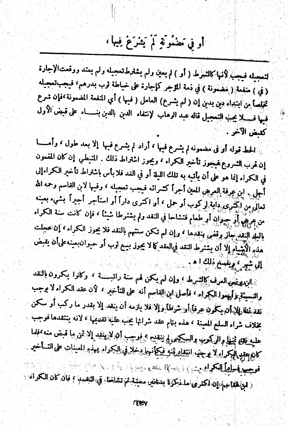 ـــــــــــــــــــــــــــــQلِتَعْجِيلِهِ فَيَجِبُ لِأَنَّهَا كَالشَّرْطِ (أَوْ) لَمْ يُعَيِّنْ وَلَمْ يُشْتَرَطْ تَعْجِيلُهُ وَلَمْ يَعْتَدْ وَوَقَعَتْ الْإِجَارَةُ (فِي) مَنْفَعَةٍ (مَضْمُونَةٍ) فِي ذِمَّةِ الْمُؤَجِّرِ كَإِجَارَةٍ عَلَى خِيَاطَةِ ثَوْبٍ بِدِرْهَمٍ، فَيَجِبُ تَعْجِيلُهُ تَخَلُّصًا مِنْ ابْتِدَاءِ دَيْنٍ بِدَيْنٍ إنْ (لَمْ يَشْرَعْ) الْعَامِلُ (فِيهَا) أَيْ الْمَنْفَعَةِ الْمَضْمُونَةِ، فَإِنْ شُرِعَ فِيهَا فَلَا يَجِبُ التَّعْجِيلُ قَالَهُ عَبْدُ الْوَهَّابِ لِانْتِفَاءِ الدَّيْنِ بِالدَّيْنِ بِنَاءً عَلَى قَبْضِ الْأَوَّلِ كَقَبْضِ الْآخَرِ. الْحَطّ قَوْلُهُ أَوْ فِي مَضْمُونِهِ لَمْ يُشْرَعْ فِيهَا، أَرَادَ لَمْ يُشْرَعْ فِيهَا إلَّا بَعْدَ طُولٍ، وَأَمَّا إنْ قَرُبَ الشُّرُوعُ فَيَحُوزُ تَأْخِيرُ الْكِرَاءِ، وَيَجُوزُ اشْتِرَاطُ ذَلِكَ.