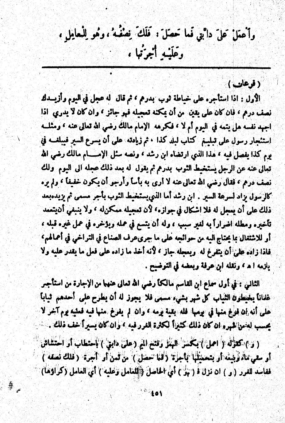الْأَوَّلُ: إذَا اسْتَأْجَرَهُ عَلَى خِيَاطَةِ ثَوْبٍ بِدِرْهَمٍ، ثُمَّ قَالَ لَهُ عَجِّلْ فِي الْيَوْمِ وَأَزِيدُك نِصْفَ دِرْهَمٍ، فَإِنْ كَانَ عَلَى يَقِينٍ مِنْ أَنْ يُمْكِنَهُ تَعْجِيلُهُ فَهُوَ جَائِزٌ، وَإِنْ كَانَ لَا يَدْرِي إذَا أَجْهَدَ نَفْسَهُ هَلْ يُتِمُّهُ فِي الْيَوْمِ أَمْ لَا، فَكَرِهَهُ الْإِمَامُ مَالِكٌ - رَضِيَ اللَّهُ تَعَالَى عَنْهُ -، وَمِثْلُهُ اسْتِئْجَارُ رَسُولٍ عَلَى تَبْلِيغِ كِتَابٍ لِبَلَدِ كَذَا، ثُمَّ زِيَادَتُهُ عَلَى أَنْ يُسْرِعَ السَّيْرَ فَيُبْلِغَهُ فِي يَوْمِ كَذَا يَفْصِلُ فِيهِ، هَذَا الَّذِي ارْتَضَاهُ ابْنُ رُشْدٍ، وَنَصُّهُ سُئِلَ الْإِمَامُ مَالِكٌ - رَضِيَ اللَّهُ تَعَالَى عَنْهُ - عَنْ الرَّجُلِ يَسْتَخِيطُ الثَّوْبَ بِدِرْهَمٍ ثُمَّ يَقُولُ لَهُ بَعْدَ ذَلِكَ عَجِّلْهُ إلَى الْيَوْمِ وَلَك نِصْفُ دِرْهَمٍ، فَقَالَ - رَضِيَ اللَّهُ تَعَالَى عَنْهُ - لَا أَرَى بِهِ بَأْسًا وَأَرْجُو أَنْ يَكُونَ خَفِيفًا، وَلَمْ يَرَهُ كَالرَّسُولِ يُزَادُ لِسُرْعَةِ السَّيْرِ. ابْنُ رُشْدٍ أَمَّا الَّذِي يَسْتَخِيطُ الثَّوْبَ بِأَجْرٍ مُسَمَّى ثُمَّ يَزِيدُهُ بَعْدَ ذَلِكَ عَلَى أَنْ يُعَجِّلَ لَهُ فَلَا إشْكَالَ فِي جَوَازِهِ لِأَنَّ تَعْجِيلَهُ مُمْكِنٌ لَهُ، وَلَا يَنْبَغِي أَنْ يَتَعَمَّدَ تَأْخِيرَهُ وَمَطْلِهِ إضْرَارًا بِهِ لِغَيْرِ سَبَبٍ، وَلَهُ أَنْ يَتَّسِعَ فِي عَمَلِهِ وَيُؤَخِّرَهُ فِي عَمَلِ غَيْرِهِ قَبْلَهُ، أَوْ لِلِاشْتِغَالِ بِمَا يَحْتَاجُ إلَيْهِ مِنْ حَوَائِجِهِ عَلَى مَا جَرَى عُرْفُ الصُّنَّاعِ فِي التَّرَاخِي فِي أَعْمَالِهِمْ، فَإِذَا زَادَهُ عَلَى أَنْ يَتَفَرَّغَ لَهُ وَيُعَجِّلَهُ جَازَ لِأَنَّهُ أَخَذَ مَا زَادَهُ عَلَى فِعْلِ مَا يَقْدِرُ عَلَيْهِ وَلَا يَلْزَمُهُ. اهـ. وَنَقَلَهُ ابْنُ عَرَفَةَ وَبَعْضُهُ فِي التَّوْضِيحِ.
