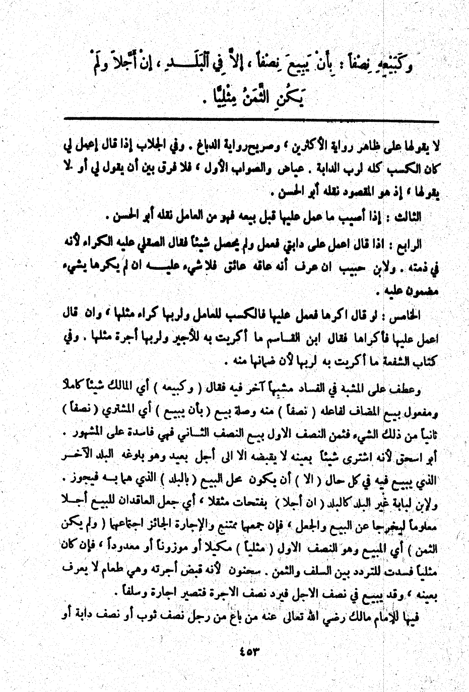 الْخَامِسُ: لَوْ قَالَ اكْرِهَا فَعَمِلَ عَلَيْهَا فَالْكَسْبُ لِلْعَامِلِ وَلِرَبِّهَا كِرَاءُ مِثْلِهَا، وَإِنْ قَالَ اعْمَلْ عَلَيْهَا فَأَكْرَاهَا فَقَالَ ابْنُ الْقَاسِمِ مَا أَكْرَيْت بِهِ لِلْأَجِيرِ وَلِرَبِّهَا أُجْرَةُ مِثْلِهَا. وَفِي كِتَابِ الشُّفْعَةِ مَا أَكْرَيْت بِهِ لِرَبِّهَا لِأَنَّ ضَمَانَهَا مِنْهُ. وَعُطِفَ عَلَى الْمُشَبَّهِ فِي الْفَسَادِ مُشَبَّهًا آخَرَ فِيهِ فَقَالَ (وَكَبَيْعِهِ) أَيْ الْمَالِكِ شَيْئًا كَامِلًا وَمَفْعُولُ بَيْعٍ الْمُضَافُ لِفَاعِلِهِ (نِصْفًا) مِنْهُ وَصِلَةُ بَيْعٍ (بِأَنْ يَبِيعَ) أَيْ الْمُشْتَرِي (نِصْفًا) ثَانِيًا مِنْ ذَلِكَ الشَّيْءِ فَثَمَنُ النِّصْفِ الْأَوَّلِ بَيْعُ النِّصْفِ الثَّانِي فَهِيَ فَاسِدَةٌ عَلَى الْمَشْهُورِ. أَبُو إِسْحَاقَ لِأَنَّهُ اشْتَرَى شَيْئًا بِعَيْنِهِ لَا يَقْبِضُهُ إلَّا إلَى أَجَلٍ بَعِيدٍ وَهُوَ بُلُوغُهُ الْبَلَدَ الْآخَرَ الَّذِي يَبِيعُ فِيهِ فِي كُلِّ حَالٍ (إلَّا) أَنْ يَكُونَ مَحَلُّ الْبَيْعِ (بِالْبَلَدِ) الَّذِي هُمَا بِهِ فَيَجُوزُ. وَلِابْنِ لُبَابَةَ غَيْرُ الْبَلَدِ كَالْبَلَدِ (إنْ أَجَّلَا) بِفَتَحَاتٍ مُثَقَّلًا، أَيْ جَعَلَ الْعَاقِدَانِ لِلْبَيْعِ أَجَلًا مَعْلُومًا لِيَخْرُجَا عَنْ الْبَيْعِ وَالْجُعْلِ، فَإِنْ جَمَعَهُمَا مُمْتَنِعٌ وَالْإِجَارَةُ الْجَائِزُ اجْتِمَاعُهُمَا (وَلَمْ يَكُنْ الثَّمَنُ) أَيْ الْمَبِيعُ وَهُوَ النِّصْفُ الْأَوَّلُ (مِثْلِيًّا) مَكِيلًا أَوْ مَوْزُونًا أَوْ مَعْدُودًا، فَإِنْ كَانَ مِثْلِيًّا فَسَدَتْ لِلتَّرَدُّدِ بَيْنَ السَّلَفِ وَالثَّمَنِ.