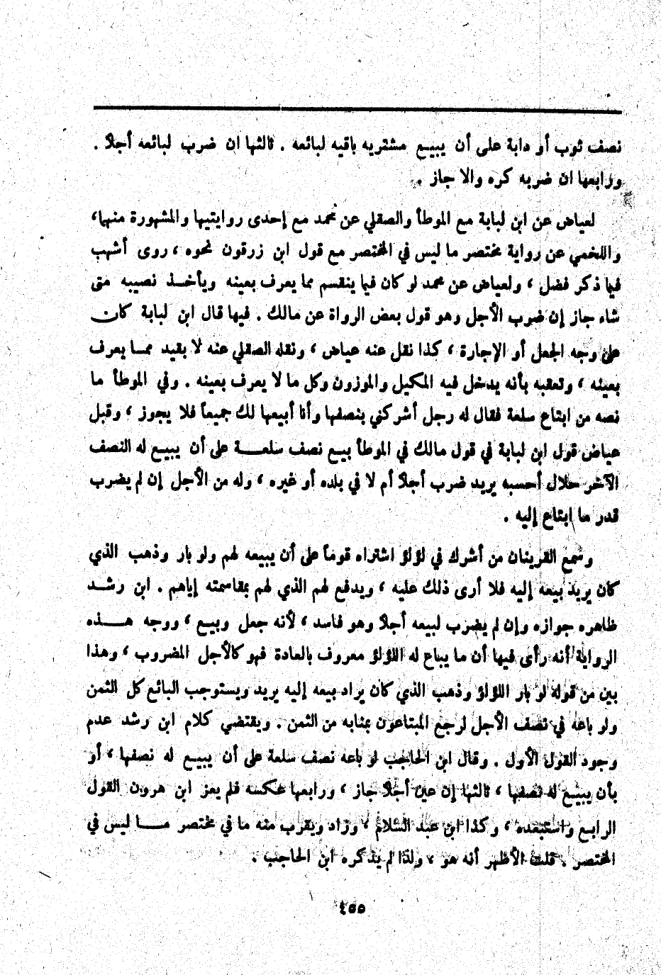 ابْنُ رُشْدٍ ظَاهِرُهُ جَوَازُهُ وَإِنْ لَمْ يَضْرِبْ لِبَيْعِهِ أَجَلًا وَهُوَ فَاسِدٌ لِأَنَّهُ جُعْلٌ وَبَيْعٌ، وَوَجْهُ هَذِهِ الرِّوَايَةِ أَنَّهُ رَأَى فِيهَا أَنَّ مَا يُبَاعُ لَهُ اللُّؤْلُؤُ مَعْرُوفٌ بِالْعَادَةِ فَهُوَ كَالْأَجَلِ الْمَضْرُوبِ، وَهَذَا بَيِّنٌ مِنْ قَوْلِهِ لَوْ بَارَ اللُّؤْلُؤُ وَذَهَبَ الَّذِي كَانَ يُرَادُ بَيْعُهُ إلَيْهِ يُرِيدُ وَيَسْتَوْجِبُ الْبَائِعُ كُلَّ الثَّمَنِ وَلَوْ بَاعَهُ فِي نِصْفِ الْأَجَلِ لَرَجَعَ الْمُبْتَاعُونَ بِمَنَابِهِ مِنْ الثَّمَنِ. وَيَقْتَضِي كَلَامُ ابْنِ رُشْدٍ عَدَمَ وُجُودِ الْقَوْلِ الْأَوَّلِ. وَقَالَ ابْنُ الْحَاجِبِ لَوْ بَاعَهُ نِصْفَ سِلْعَةٍ عَلَى أَنْ يَبِيعَ لَهُ نِصْفَهَا، أَوْ بِأَنْ يَبِيعَ لَهُ نِصْفَهَا، ثَالِثُهَا إنْ عَيَّنَ أَجَلًا جَازَ، وَرَابِعُهَا عَكْسُهُ فَلَمْ يَعْزُ ابْنُ هَارُونَ الْقَوْلَ الرَّابِعَ وَاسْتَبْعَدَهُ، وَكَذَا ابْنُ عَبْدِ السَّلَامِ، وَزَادَ وَيَقْرَبُ مِنْهُ مَا فِي مُخْتَصَرِ مَا لَيْسَ فِي الْمُخْتَصَرِ. قُلْت الْأَظْهَرُ أَنَّهُ هُوَ، وَلِذَا لَمْ يَذْكُرْهُ ابْنُ الْحَاجِبِ.