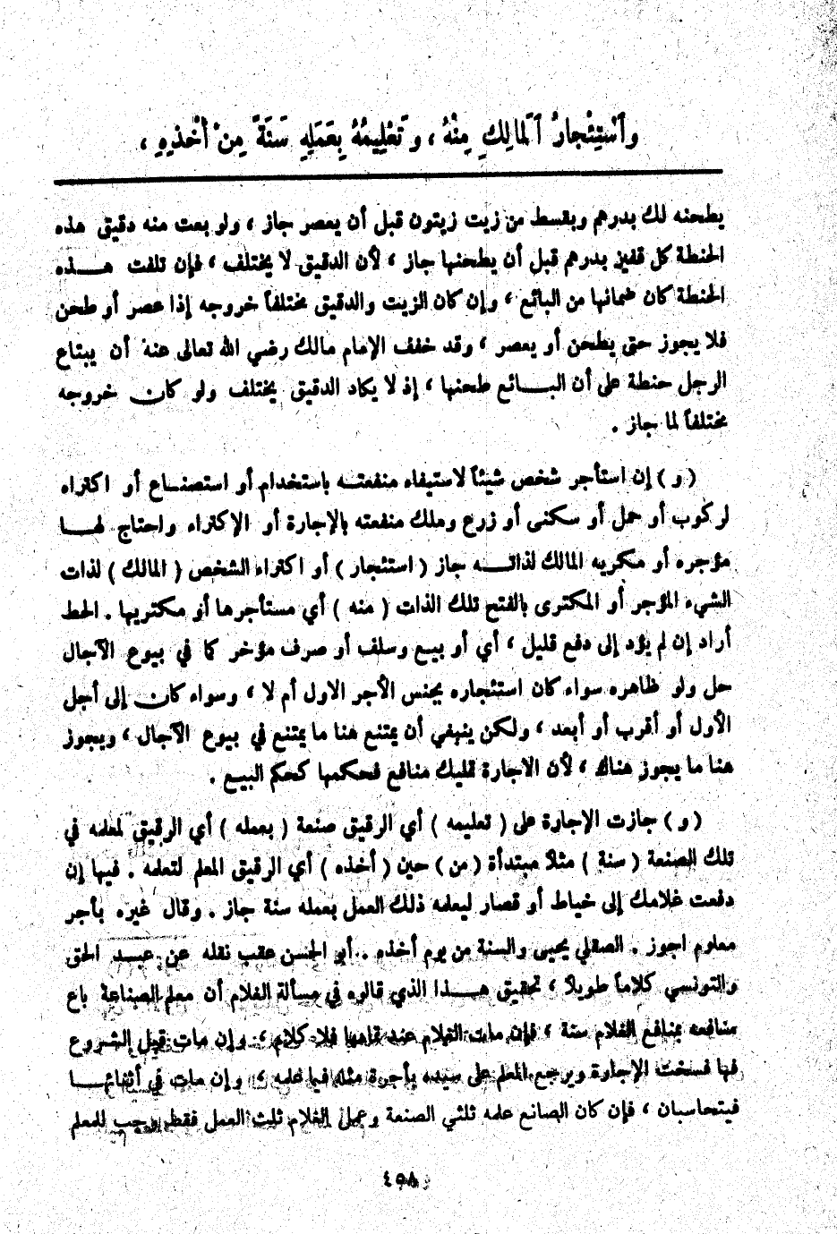 (وَ) جَازَتْ الْإِجَارَةُ عَلَى (تَعْلِيمِهِ) أَيْ الرَّقِيقِ صَنْعَةً (بِعَمَلِهِ) أَيْ الرَّقِيقِ لِمُعَلِّمِهِ فِي تِلْكَ الصَّنْعَةِ (سَنَةً) مَثَلًا مُبْتَدَأَةٌ (مِنْ) حِينَ (أَخَذَهُ) أَيْ الرَّقِيقَ الْمُعَلَّمَ لِتَعَلُّمِهِ. فِيهَا إنْ دَفَعْت غُلَامَك إلَى خَيَّاطٍ أَوْ قَصَّارٍ لَيُعَلِّمَهُ ذَلِكَ الْعَمَلَ بِعَمَلِهِ سَنَةً جَازَ. وَقَالَ غَيْرُهُ بِأَجْرٍ مَعْلُومٍ أُجَوِّزُ. الصِّقِلِّيُّ يَحْيَى وَالسَّنَةُ مِنْ يَوْمَ أَخَذَهُ. أَبُو الْحَسَنِ عَقِبَ نَقْلِهِ عَنْ عَبْدِ الْحَقِّ وَالتُّونُسِيِّ كَلَامًا طَوِيلًا، تَحْقِيقُ هَذَا الَّذِي قَالُوهُ فِي مَسْأَلَةِ الْغُلَامِ أَنَّ مُعَلِّمَ الصِّنَاعَةِ بَاعَ مَنَافِعَهُ بِمَنَافِعِ الْغُلَامِ سَنَةً، فَإِنْ مَاتَ الْغُلَامُ عِنْدَ تَمَامِهَا فَلَا كَلَامَ، وَإِنْ مَاتَ قَبْلَ الشُّرُوعِ فَهَا فُسِخَتْ الْإِجَارَةُ وَيَرْجِعُ الْمُعَلِّمُ عَلَى سَيِّدِهِ بِأُجْرَةِ مِثْلِهِ فِيمَا عَلِمَهُ، وَإِنْ مَاتَ فِي أَثْنَائِهَا فَيَتَحَاسَبَانِ، فَإِنْ كَانَ الصَّانِعُ عَلَّمَهُ ثُلُثَيْ الصَّنْعَةِ وَعَمِلَ الْغُلَامُ ثُلُثَ الْعَمَلِ فَقَطْ وَجَبَ لِلْمُعَلِّمِ