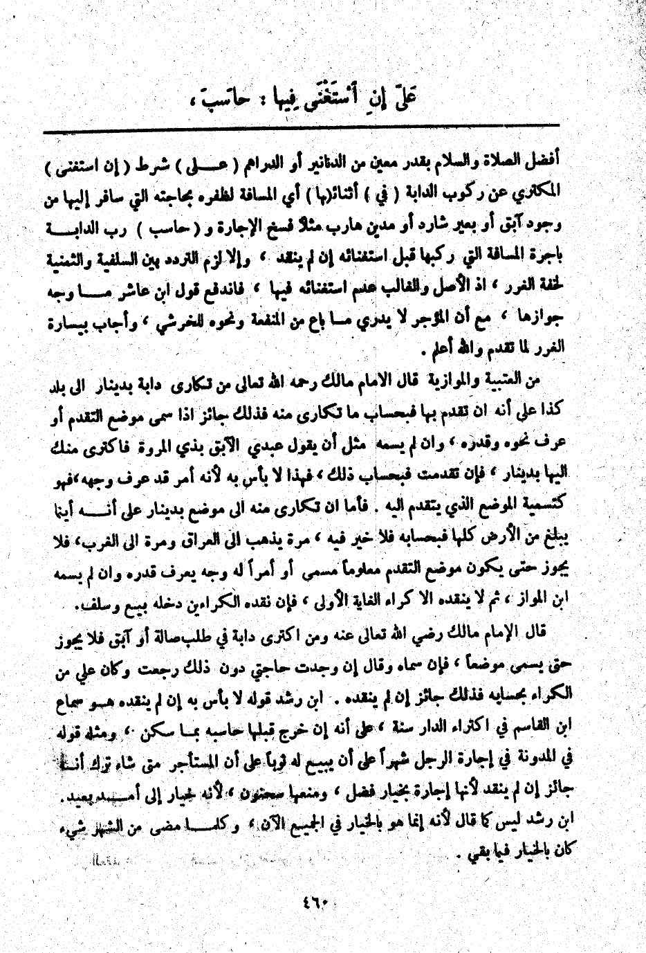 ـــــــــــــــــــــــــــــQأَفْضَلُ الصَّلَاةِ وَالسَّلَامِ بِقَدْرٍ مُعَيَّنٍ مِنْ الدَّنَانِيرِ أَوْ الدَّرَاهِمِ (عَلَى) شَرْطِ (إنْ اسْتَغْنَى) الْمُكْتَرِي عَنْ رُكُوبِ الدَّابَّةِ (فِي) أَثْنَاءِ (هَا) أَيْ الْمَسَافَةِ لِظَفَرِهِ بِحَاجَتِهِ الَّتِي سَافَرَ إلَيْهَا مِنْ وُجُودِ آبِقٍ أَوْ بَعِيرٍ شَارِدٍ أَوْ مَدِينٍ هَارِبٍ مَثَلًا فَسَخَ الْإِجَارَةَ و (حَاسَبَ) رَبَّ الدَّابَّةِ بِأُجْرَةِ الْمَسَافَةِ الَّتِي رَكِبَهَا قَبْلَ اسْتِغْنَائِهِ إنْ لَمْ يَنْقُدْ، وَإِلَّا لَزِمَ التَّرَدُّدُ بَيْنَ السَّلَفِيَّةِ وَالثَّمَنِيَّةِ لِخِفَّةِ الْغَرَرِ، إذْ الْأَصْلُ وَالْغَالِبُ عَدَمُ اسْتِغْنَائِهِ فِيهَا، فَانْدَفَعَ قَوْلُ ابْنِ عَاشِرٍ مَا وَجْهُ جَوَازِهَا، مَعَ أَنَّ الْمُؤَجِّرَ لَا يَدْرِي مَا بَاعَ مِنْ الْمَنْفَعَةِ وَنَحْوُهُ لِلْخَرَشِيِّ، وَأَجَابَ بِيَسَارَةِ الْغَرَرِ لِمَا تَقَدَّمَ وَاَللَّهُ أَعْلَمُ. مِنْ الْعُتْبِيَّةِ وَالْمَوَّازِيَّةِ قَالَ الْإِمَامُ مَالِكٌ - رَحِمَهُ اللَّهُ تَعَالَى - مَنْ تَكَارَى دَابَّةً بِدِينَارٍ إلَى بَلَدِ كَذَا عَلَى أَنَّهُ إنْ تَقَدَّمَ بِهَا فَبِحِسَابِ مَا تَكَارَى مِنْهُ فَذَلِكَ جَائِزٌ إذَا سَمَّى مَوْضِعَ التَّقَدُّمِ أَوْ عَرَفَ نَحْوَهُ وَقَدَّرَهُ، وَإِنْ لَمْ يُسَمِّهِ مِثْلَ أَنْ يَقُولَ عَبْدِي الْآبِقُ بِذِي الْمَرْوَةِ فَاكْتَرَى مِنْك إلَيْهَا بِدِينَارٍ، فَإِنْ تَقَدَّمَتْ فَبِحِسَابِ ذَلِكَ، فَهَذَا لَا بَأْسَ بِهِ لِأَنَّهُ أَمْرٌ قَدْ عُرِفَ وَجْهُهُ، فَهُوَ كَتَسْمِيَةِ الْمَوْضِعِ الَّذِي يَتَقَدَّمُ إلَيْهِ. فَأَمَّا إنْ تَكَارَى مِنْهُ إلَى مَوْضِعٍ بِدِينَارٍ عَلَى أَنَّهُ أَيْنَمَا يَبْلُغُ مِنْ الْأَرْضِ كُلِّهَا فَبِحِسَابِهِ فَلَا خَيْرَ فِيهِ، مَرَّةً يَذْهَبُ إلَى الْعِرَاقِ وَمَرَّةً إلَى الْغَرْبِ، فَلَا يَجُوزُ حَتَّى يَكُونَ مَوْضِعُ التَّقَدُّمِ مَعْلُومًا مُسَمًّى أَوْ أَمْرًا لَهُ وَجْهٌ يُعْرَفُ قَدْرُهُ وَإِنْ لَمْ يُسَمِّهِ ابْنُ الْمَوَّازِ، ثُمَّ لَا يَنْقُدُهُ إلَّا كِرَاءَ الْغَايَةِ الْأُولَى، فَإِنْ نَقَدَهُ الْكِرَاءَيْنِ دَخَلَهُ بَيْعٌ وَسَلَفٌ. قَالَ الْإِمَامُ مَالِكٌ - رَضِيَ اللَّهُ تَعَالَى عَنْهُ - وَمَنْ اكْتَرَى دَابَّةً فِي طَلَبِ ضَالَّةٍ أَوْ آبِقٍ فَلَا يَجُوزُ حَتَّى يُسَمِّيَ مَوْضِعًا، فَإِنْ سَمَّاهُ وَقَالَ إنْ وَجَدْت حَاجَتِي دُونَ ذَلِكَ رَجَعْت وَكَانَ عَلَيَّ مِنْ الْكِرَاءِ بِحِسَابِهِ فَذَلِكَ جَائِزٌ إنْ لَمْ يَنْقُدْهُ.