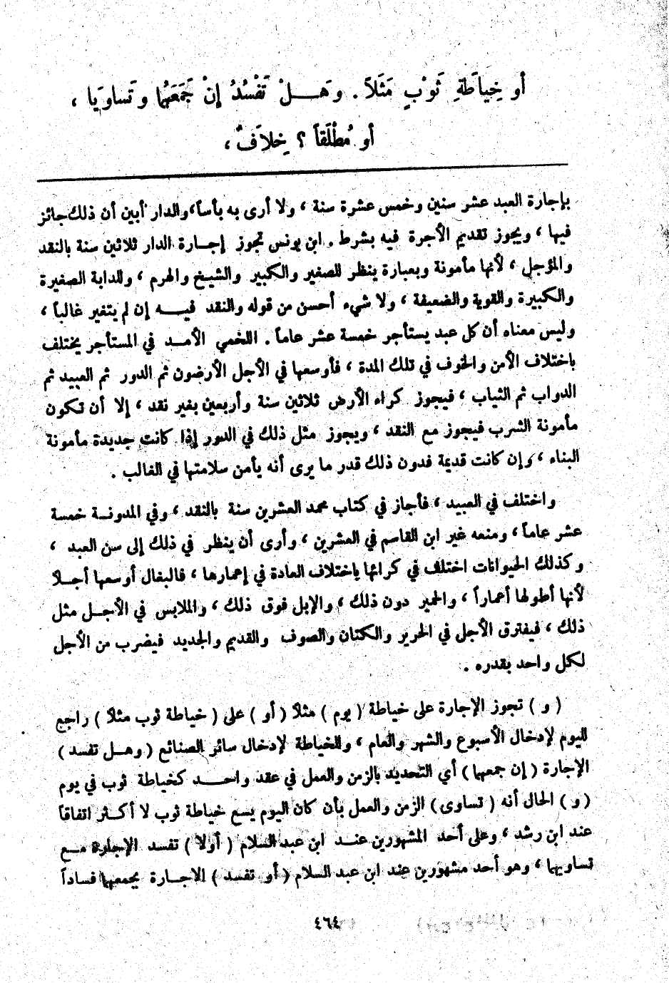 ـــــــــــــــــــــــــــــQبِإِجَارَةِ الْعَبْدِ عَشْرَ سِنِينَ وَخَمْسَ عَشْرَةَ سَنَةً، وَلَا أَرَى بِهِ بَأْسًا، وَالدَّارُ أَبْيَنُ أَنَّ ذَلِكَ جَائِزٌ فِيهَا، وَيَجُوزُ تَقْدِيمُ الْأُجْرَةِ فِيهِ بِشَرْطٍ. ابْنُ يُونُسَ تَجُوزُ إجَارَةُ الدَّارِ ثَلَاثِينَ سَنَةً بِالنَّقْدِ وَالْمُؤَجَّلِ لِأَنَّهَا مَأْمُونَةٌ وَبِعِبَارَةٍ يَنْظُرُ لِلصَّغِيرِ وَالْكَبِيرِ وَالشَّيْخِ وَالْهَرَمِ، وَلِلدَّابَّةِ الصَّغِيرَةِ وَالْكَبِيرَةِ وَالْقَوِيَّةِ وَالضَّعِيفَةِ، وَلَا شَيْءَ أَحْسَنُ مِنْ قَوْلِهِ وَالنَّقْدِ فِيهِ إنْ لَمْ يَتَغَيَّرْ غَالِبًا، وَلَيْسَ مَعْنَاهُ أَنَّ كُلَّ عَبْدٍ يَسْتَأْجِرُ خَمْسَةَ عَشَرَ عَامًا. اللَّخْمِيُّ الْأَمَدُ فِي الْمُسْتَأْجَرِ يَخْتَلِفُ بِاخْتِلَافِ الْأَمْنِ وَالْخَوْفِ فِي تِلْكَ الْمُدَّةِ، فَأَوْسَعُهَا فِي الْأَجَلِ الْأَرَضُونَ ثُمَّ الدُّورُ ثُمَّ الْعَبِيدُ ثُمَّ الدَّوَابُّ ثُمَّ الثِّيَابُ، فَيَحُوزُ كِرَاءُ الْأَرْضِ ثَلَاثِينَ سَنَةً وَأَرْبَعِينَ بِغَيْرِ نَقْدٍ، إلَّا أَنْ تَكُونَ مَأْمُونَةَ الشِّرْبِ فَيَجُوزُ مَعَ النَّقْدِ، وَيَجُوزُ مِثْلُ ذَلِكَ فِي الدُّورِ إذَا كَانَتْ جَدِيدَةً مَأْمُونَةَ الْبِنَاءِ، وَإِنْ كَانَتْ قَدِيمَةً فَدُونَ ذَلِكَ قَدْرَ مَا يَرَى أَنَّهُ يَأْمَنُ سَلَامَتَهَا فِي الْغَالِبِ. وَاخْتُلِفَ فِي الْعَبِيدِ، فَأَجَازَ فِي كِتَابِ مُحَمَّدٍ الْعِشْرِينَ سَنَةً بِالنَّقْدِ، وَفِي الْمُدَوَّنَةِ خَمْسَةَ عَشَرَ عَامًا، وَمَنَعَهُ غَيْرُ ابْنِ الْقَاسِمِ فِي الْعِشْرِينَ، وَأَرَى أَنْ يُنْظَرَ فِي ذَلِكَ إلَى سَنِّ الْعَبْدِ، وَكَذَلِكَ الْحَيَوَانَاتُ اُخْتُلِفَ فِي كِرَائِهَا بِاخْتِلَافِ الْعَادَةِ فِي إعْمَارِهَا، فَالْبِغَالُ أَوْسَعُهَا أَجَلًا لِأَنَّهَا أَطْوَلُهَا أَعْمَارًا، وَالْحَمِيرُ دُونَ ذَلِكَ، وَالْإِبِلُ فَوْقَ ذَلِكَ، وَالْمَلَابِسُ فِي الْأَجَلِ مِثْلُ ذَلِكَ، فَيَفْتَرِقُ الْأَجَلُ فِي الْحَرِيرِ وَالْكَتَّانِ وَالصُّوفِ وَالْقَدِيمِ وَالْجَدِيدِ فَيَضْرِبُ مِنْ الْأَجَلِ لِكُلِّ وَاحِدٍ بِقَدْرِهِ.