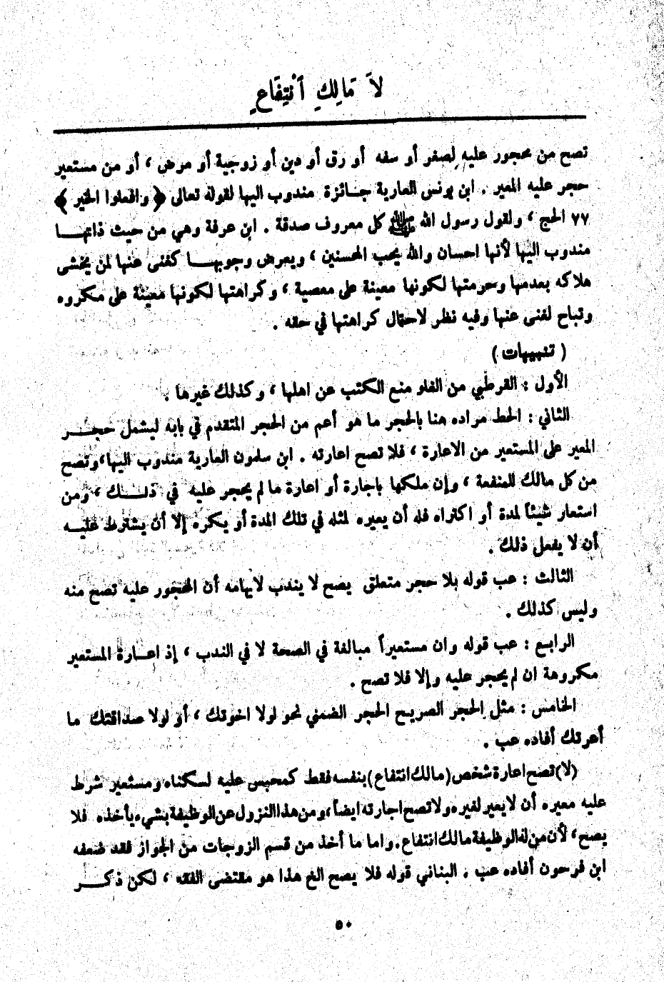 الثَّانِي: الْحَطُّ مُرَادُهُ هُنَا بِالْحَجْرِ مَا هُوَ أَعَمُّ مِنْ الْحَجْرِ الْمُتَقَدِّمِ فِي بَابِهِ لِيَشْمَلَ حَجْرَ الْمُعِيرِ عَلَى الْمُسْتَعِيرِ مِنْ الْإِعَارَةِ، فَلَا تَصِحُّ إعَارَتُهُ. ابْنُ سَلْمُونٍ الْعَارِيَّةُ مَنْدُوبٌ إلَيْهَا، وَتَصِحُّ مِنْ كُلِّ مَالِكٍ لِلْمَنْفَعَةِ، وَإِنْ مَلَكَهَا بِإِجَارَةٍ أَوْ إعَارَةٍ مَا لَمْ يُحْجَرْ عَلَيْهِ فِي ذَلِكَ، وَمَنْ اسْتَعَارَ شَيْئًا لِمُدَّةٍ أَوْ اكْتَرَاهُ فَلَهُ أَنْ يُعِيرَهُ لِمِثْلِهِ فِي تِلْكَ الْمُدَّةِ أَوْ يُكْرَهُ إلَّا أَنْ يَشْتَرِطَ عَلَيْهِ أَنْ لَا يَفْعَلَ ذَلِكَ.
