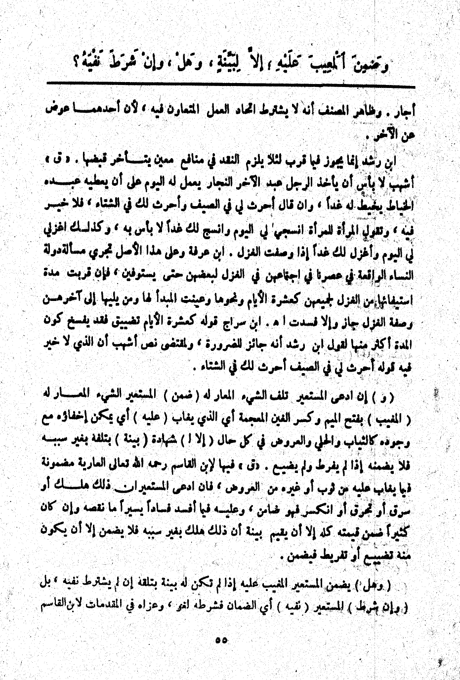 (وَهَلْ) يَضْمَنُ الْمُسْتَعِيرُ الْمَغِيبَ عَلَيْهِ إذَا لَمْ تَكُنْ لَهُ بَيِّنَةٌ بِتَلَفِهِ إنْ لَمْ يَشْتَرِطْ نَفْيَهُ، بَلْ (وَإِنْ شَرَطَ) الْمُسْتَعِيرُ (نَفْيَهُ) أَيْ الضَّمَانَ فَشَرْطُهُ لَغْوٌ، وَعَزَاهُ فِي الْمُقَدِّمَاتِ لِابْنِ الْقَاسِمِ