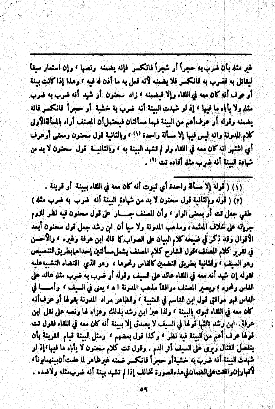 ـــــــــــــــــــــــــــــQغَيْرِ مِثْلِهِ بِأَنْ ضَرَبَ بِهِ حَجَرًا أَوْ شَجَرًا فَانْكَسَرَ فَإِنَّهُ يَضْمَنُهُ وَنَصُّهَا، وَإِنْ اسْتَعَارَ سَيْفًا لِيُقَاتِلَ بِهِ فَضَرَبَ بِهِ فَانْكَسَرَ فَلَا يَضْمَنُهُ لِأَنَّهُ فَعَلَ بِهِ مَا أُذِنَ لَهُ فِيهِ، وَهَذَا إذَا كَانَتْ بَيِّنَةٌ أَوْ عُرْفٌ أَنَّهُ كَانَ مَعَهُ فِي اللِّقَاءِ وَإِلَّا فَيَضْمَنُهُ، زَادَ سَحْنُونٌ أَوْ شَهِدَ أَنَّهُ ضَرَبَ بِهِ ضَرْبَ مِثْلِهِ وَلَا يَأْبَاهُ مَا فِيهَا إذْ لَوْ شَهِدَتْ الْبَيِّنَةُ أَنَّهُ ضَرَبَ بِهِ خَشَبَةً أَوْ حَجَرًا فَانْكَسَرَ فَإِنَّهُ يَضْمَنُهُ وَقَوْلُهُ أَوْ عُرْفٌ أَعَمُّ مِنْ الْبَيِّنَةِ فَهُمَا مَسْأَلَتَانِ فَيُحْتَمَلُ أَنَّ الْمُصَنِّفَ أَرَادَ بِالْمَسْأَلَةِ الْأُولَى كَلَامَ الْمُدَوَّنَةِ وَأَنَّهُ لَيْسَ فِيهَا إلَّا مَسْأَلَةٌ وَاحِدَةٌ، وَبِالثَّانِيَةِ قَوْلَ سَحْنُونٍ وَمَعْنَى أَوْ عُرْفٌ أَيْ اشْتَهَرَ أَنَّهُ كَانَ مَعَهُ فِي اللِّقَاءِ وَلَوْ لَمْ تَشْهَدْ الْبَيِّنَةُ بِهِ، وَبِالثَّانِيَةِ قَوْلُ سَحْنُونٍ لَا بُدَّ مِنْ شَهَادَةِ الْبَيِّنَةِ أَنَّهُ ضَرَبَ مِثْلَهُ أَفَادَهُ تت.