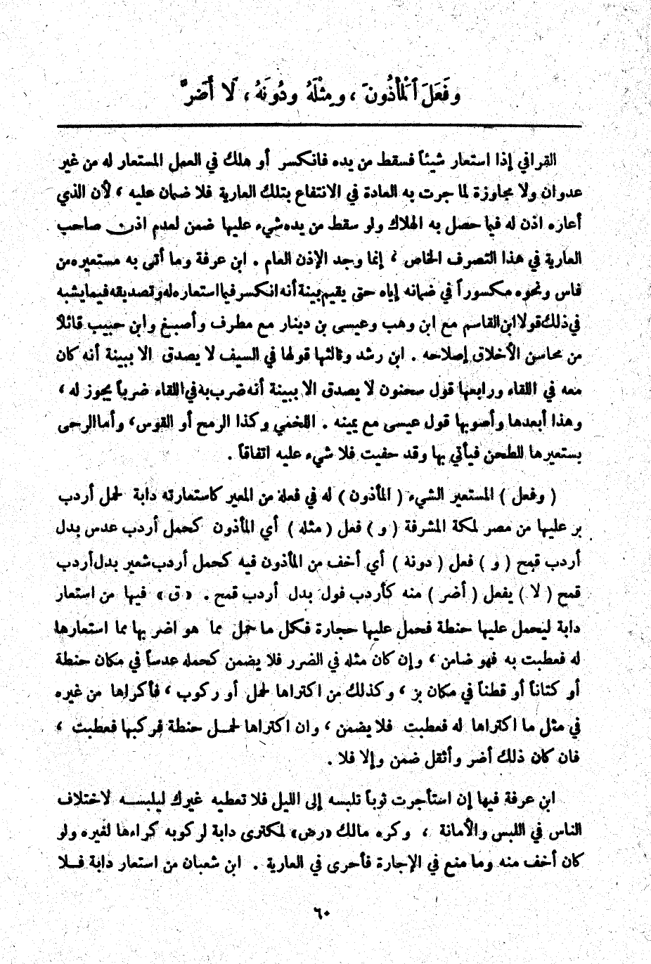 (وَفِعْلُ) الْمُسْتَعِيرِ الشَّيْءَ (الْمَأْذُونَ) لَهُ فِي فِعْلِهِ مِنْ الْمُعِيرِ كَاسْتِعَارَتِهِ دَابَّةً لِحَمْلِ إرْدَبِّ بُرٍّ عَلَيْهَا مِنْ مِصْرَ لِمَكَّةَ الْمُشَرَّفَةِ (وَ) فَعَلَ (مِثْلَهُ) أَيْ الْمَأْذُونَ كَحَمْلِ إرْدَبِّ عَدَسٍ بَدَلَ إرْدَبِّ قَمْحٍ (وَ) فَعَلَ (دُونَهُ) أَيْ أَخَفَّ مِنْ الْمَأْذُونِ فِيهِ كَحَمْلِ إرْدَبِّ شَعِيرٍ بَدَلَ إرْدَبِّ قَمْحٍ (لَا) يَفْعَلُ (أَضَرَّ) مِنْهُ كَإِرْدَبِّ فُولٍ بَدَلَ إرْدَبِّ قَمْحٍ. " ق " فِيهَا مَنْ اسْتَعَارَ دَابَّةً لِيَحْمِلَ عَلَيْهَا حِنْطَةً فَحَمَلَ عَلَيْهَا حِجَارَةً فَكُلُّ مَا حَمَلَ مِمَّا هُوَ أَضَرُّ بِهَا مِمَّا اسْتَعَارَهَا لَهُ فَعَطِبَتْ بِهِ فَهُوَ ضَامِنٌ، وَإِنْ كَانَ مِثْلُهُ فِي الضَّرَرِ فَلَا يَضْمَنُ كَحَمْلِهِ عَدَسًا فِي مَكَانِ حِنْطَةٍ أَوْ كَتَّانًا أَوْ قُطْنًا فِي مَكَانِ بَزٍّ، وَكَذَلِكَ مَنْ اكْتَرَاهَا لِحَمْلٍ أَوْ رُكُوبٍ، فَأَكْرَاهَا مِنْ غَيْرِهِ فِي مِثْلِ مَا اكْتَرَاهَا لَهُ فَعَطِبَتْ فَلَا يَضْمَنُ، وَإِنْ اكْتَرَاهَا لِحَمْلِ حِنْطَةٍ فَرَكِبَهَا فَعَطِبَتْ، فَإِنْ كَانَ ذَلِكَ أَضَرَّ وَأَثْقَلَ ضَمِنَ وَإِلَّا فَلَا.