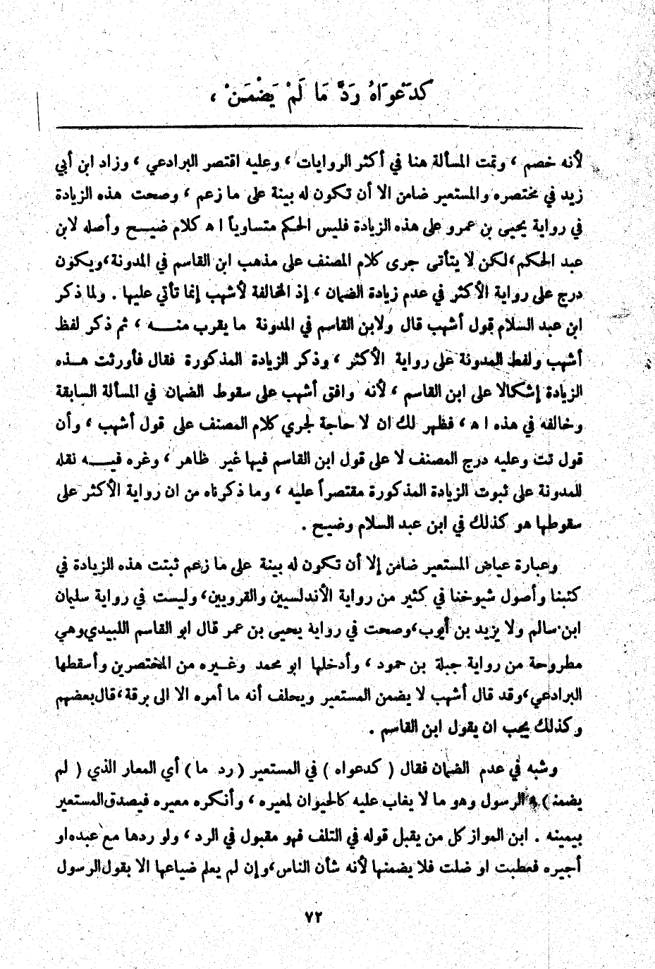 ـــــــــــــــــــــــــــــQلِأَنَّهُ خَصْمٌ، وَتَمَّتْ الْمَسْأَلَةُ هُنَا فِي أَكْثَرِ الرِّوَايَاتِ، وَعَلَيْهِ اقْتَصَرَ الْبَرَادِعِيُّ، وَزَادَ ابْنُ أَبِي زَيْدٍ فِي مُخْتَصَرِهِ وَالْمُسْتَعِيرُ ضَامِنٌ إلَّا أَنْ تَكُونَ لَهُ بَيِّنَةٌ عَلَى مَا زَعَمَ، وَصَحَّتْ هَذِهِ الزِّيَادَةُ فِي رِوَايَةِ يَحْيَى بْنِ عَمْرٍو عَلَى هَذِهِ الزِّيَادَةِ فَلَيْسَ الْحُكْمُ مُتَسَاوِيًا اهـ كَلَامُ ضَيْحٍ وَأَصْلُهُ لِابْنِ عَبْدِ الْحَكَمِ، لَكِنْ لَا يَتَأَتَّى جَرْيُ كَلَامِ الْمُصَنِّفِ عَلَى مَذْهَبِ ابْنِ الْقَاسِمِ فِي الْمُدَوَّنَةِ، وَيَكُونُ دَرَجَ عَلَى رِوَايَةِ الْأَكْثَرِ فِي عَدَمِ زِيَادَةِ الضَّمَانِ، إذْ الْمُخَالَفَةُ لِأَشْهَبَ إنَّمَا تَأْتِي عَلَيْهَا. وَلَمَّا ذَكَرَ ابْنُ عَبْدِ السَّلَامِ قَوْلَ أَشْهَبَ قَالَ وَلِابْنِ الْقَاسِمِ فِي الْمُدَوَّنَةِ مَا يَقْرُبُ مِنْهُ، ثُمَّ ذَكَرَ لَفْظَ أَشْهَبَ وَلَفْظَ الْمُدَوَّنَةِ عَلَى رِوَايَةِ الْأَكْثَرِ، وَذَكَرَ الزِّيَادَةَ الْمَذْكُورَةَ فَقَالَ فَأَوْرَثَتْ هَذِهِ الزِّيَادَةُ إشْكَالًا عَلَى ابْنِ الْقَاسِمِ لِأَنَّهُ وَافَقَ أَشْهَبَ عَلَى سُقُوطِ الضَّمَانِ فِي الْمَسْأَلَةِ السَّابِقَةِ وَخَالَفَهُ فِي هَذِهِ. اهـ. فَظَهَرَ لَك أَنْ لَا حَاجَةَ لِجَرْيِ كَلَامِ الْمُصَنِّفِ عَلَى قَوْلِ أَشْهَبَ، وَأَنَّ قَوْلَ تت وَعَلَيْهِ دَرَجَ الْمُصَنِّفُ لَا عَلَى قَوْلِ ابْنِ الْقَاسِمِ فِيهَا غَيْرُ ظَاهِرٍ، وَغَرَّهُ فِيهِ نَقْلُهُ الْمُدَوَّنَةُ عَلَى ثُبُوتِ الزِّيَادَةِ الْمَذْكُورَةِ مُقْتَصِرًا عَلَيْهِ، وَمَا ذَكَرْنَاهُ مِنْ أَنَّ رِوَايَةَ الْأَكْثَرِ عَلَى سُقُوطِهَا هُوَ كَذَلِكَ فِي ابْنِ عَبْدِ السَّلَامِ وَضَيْحٍ.