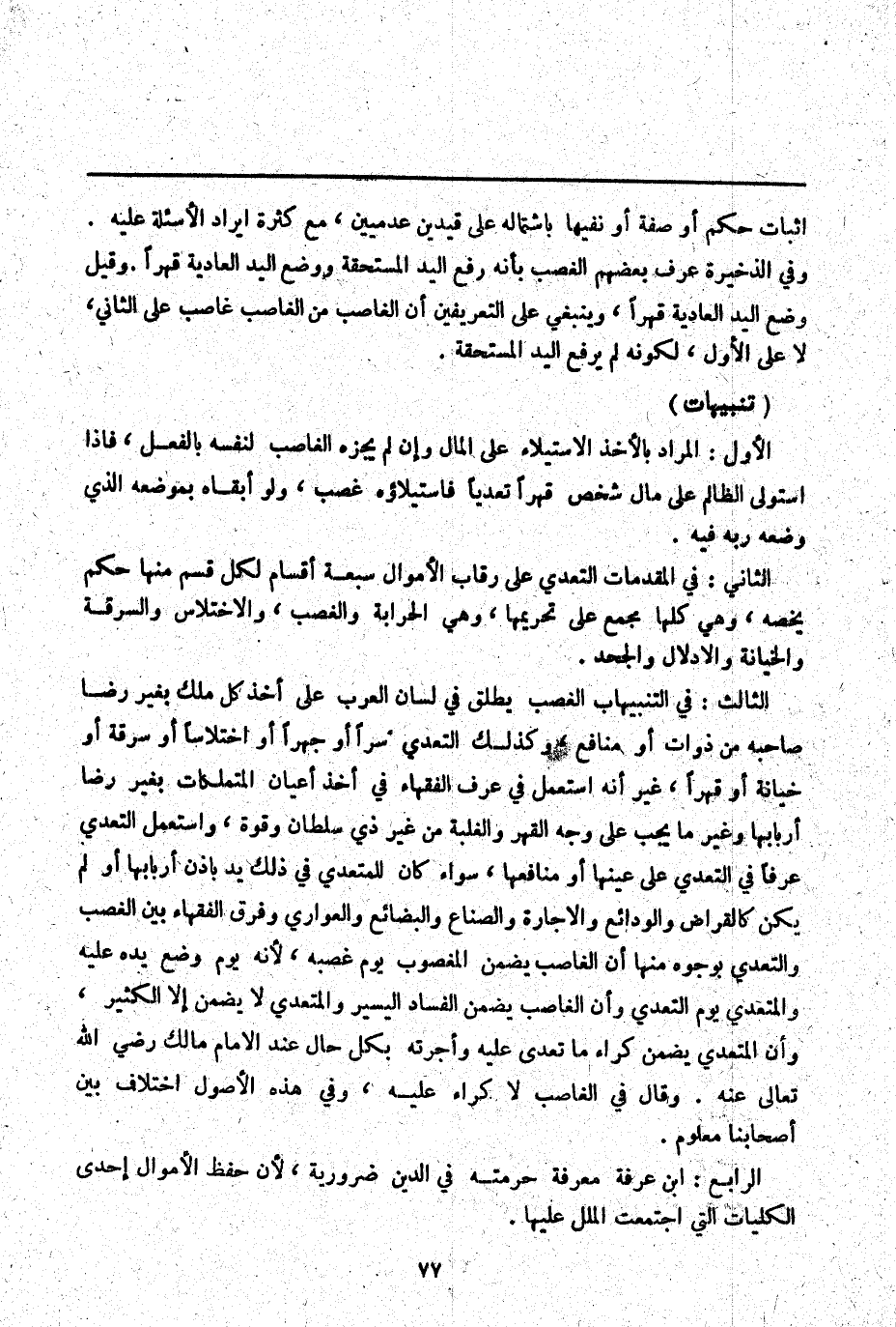 الثَّانِي: فِي الْمُقَدِّمَاتِ التَّعَدِّي عَلَى رِقَابِ الْأَمْوَالِ سَبْعَةُ أَقْسَامٍ لِكُلِّ قِسْمٍ مِنْهَا حُكْمٌ يَخُصُّهُ، وَهِيَ كُلُّهَا مُجْمَعٌ عَلَى تَحْرِيمِهَا، وَهِيَ الْحِرَابَةُ وَالْغَصْبُ، وَالِاخْتِلَاسُ وَالسَّرِقَةُ وَالْخِيَانَةُ وَالْإِدْلَالُ وَالْجَحْدُ.