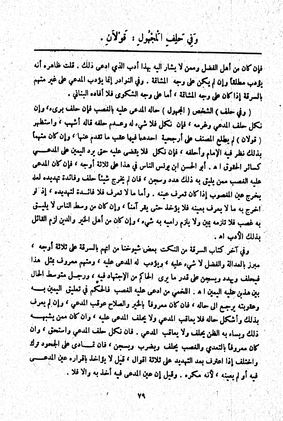 (وَفِي حَلِفِ) الشَّخْصِ (الْمَجْهُولِ) حَالُهُ الْمُدَّعَى عَلَيْهِ بِالْغَصْبِ فَإِنْ حَلَفَ بَرِئَ، وَإِنْ نَكَلَ حَلَفَ الْمُدَّعِي وَغَرِمَهُ، فَإِنْ نَكَلَ فَلَا شَيْءَ لَهُ وَعَدَمُ حَلِفِهِ قَالَهُ أَشْهَبُ وَاسْتُظْهِرَ (قَوْلَانِ) لَمْ يَطَّلِعْ الْمُصَنِّفُ عَلَى أَرْجَحِيَّةِ أَحَدِهِمَا فِيهَا عَقِبَ مَا تَقَدَّمَ عَنْهَا، وَإِنْ كَانَ مُتَّهَمًا بِذَلِكَ نَظَرَ فِيهِ الْإِمَامُ وَأَحْلَفَهُ، فَإِنْ نَكَلَ فَلَا يَقْضِي عَلَيْهِ حَتَّى يَرُدَّ الْيَمِينَ عَلَى الْمُدَّعِي كَسَائِرِ الْحُقُوقِ اهـ. أَبُو الْحَسَنِ ابْنُ يُونُسَ النَّاسُ فِي هَذَا عَلَى ثَلَاثَةِ أَوْجُهٍ، فَإِنْ كَانَ الْمُدَّعَى عَلَيْهِ الْغَصْبَ مِمَّنْ يَلِيقُ بِهِ ذَلِكَ هُدِّدَ وَسُجِنَ، فَإِنْ لَمْ يُخْرِجْ شَيْئًا حَلَفَ وَفَائِدَةُ تَهْدِيدِهِ لَعَلَّهُ يُخْرِجُ عَيْنَ الْمَغْصُوبِ إذَا كَانَ تُعْرَفُ عَيْنُهُ. وَأَمَّا مَا لَا تُعْرَفُ فَلَا فَائِدَةَ لِتَهْدِيدِهِ إذْ لَوْ أَخْرَجَ بِهِ مَا لَا يُعْرَفُ بِعَيْنِهِ فَلَا يُؤْخَذُ حَتَّى يُقِرَّ آمِنًا، وَإِنْ كَانَ مِنْ وَسَطِ النَّاسِ لَا يَلِيقُ بِهِ غَصْبٌ فَلَا تَلْزَمُهُ يَمِينٌ وَلَا يَلْزَمُ رَامِيهِ بِهِ شَيْءٌ، وَإِنْ كَانَ مِنْ أَهْلِ الْخَيْرِ وَالدِّينِ لَزِمَ الْقَائِلَ بِذَلِكَ الْأَدَبُ اهـ.