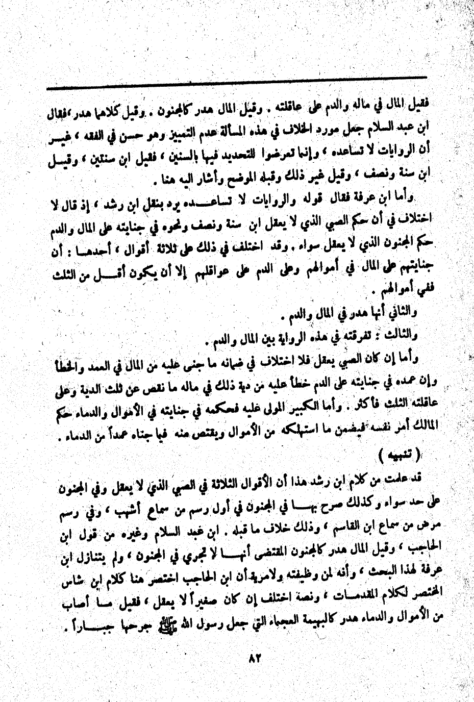 قَدْ عَلِمْت مِنْ كَلَامِ ابْنِ رُشْدٍ هَذَا أَنَّ الْأَقْوَالَ الثَّلَاثَةَ فِي الصَّبِيِّ الَّذِي لَا يَعْقِلُ وَفِي الْمَجْنُونِ عَلَى حَدِّ سَوَاءٍ وَكَذَلِكَ صَرَّحَ بِهَا فِي الْمَجْنُونِ فِي أَوَّلِ رَسْمٍ مِنْ سَمَاعِ أَشْهَبَ، وَفِي رَسْمٍ مُرْضٍ مِنْ سَمَاعِ ابْنِ الْقَاسِمِ، وَذَلِكَ خِلَافُ مَا قَبْلَهُ. ابْنُ عَبْدِ السَّلَامِ وَغَيْرُهُ مِنْ قَوْلِ ابْنِ الْحَاجِبِ، وَقِيلَ الْمَالُ هَدَرٌ كَالْمَجْنُونِ الْمُقْتَضِي أَنَّهَا لَا تَجْرِي فِي الْمَجْنُونِ، وَلَمْ يَتَنَازَلْ ابْنُ عَرَفَةَ لِهَذَا الْبَحْثِ، وَإِنَّهُ لِمَنْ وَظِيفَتِهِ وَلَا مِرْيَةَ أَنَّ ابْنَ الْحَاجِبِ اخْتَصَرَ هُنَا كَلَامَ ابْنِ شَاسٍ الْمُخْتَصِرِ لِكَلَامِ الْمُقَدِّمَاتِ، وَنَصُّهُ اُخْتُلِفَ إنْ كَانَ صَغِيرًا لَا يَعْقِلُ، فَقِيلَ مَا أَصَابَ مِنْ الْأَمْوَالِ وَالدِّمَاءِ هَدَرٌ كَالْبَهِيمَةِ الْعَجْمَاءِ الَّتِي جَعَلَ رَسُولُ اللَّهِ - صَلَّى اللَّهُ عَلَيْهِ وَسَلَّمَ - جُرْحَهَا جُبَارًا.