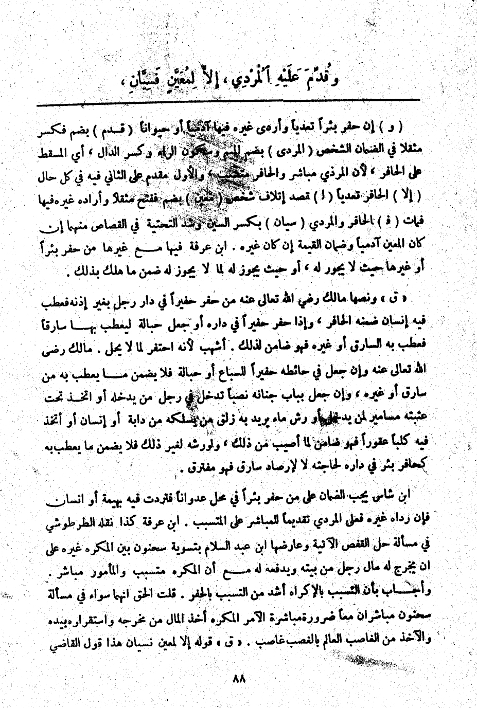 ـــــــــــــــــــــــــــــQوَ) إنْ حَفَرَ بِئْرًا تَعَدِّيًا وَأَرْدَى غَيْرُهُ فِيهَا آدَمِيًّا أَوْ حَيَوَانًا (قُدِّمَ) بِضَمٍّ فَكَسْرٍ مُثَقَّلًا فِي الضَّمَانِ الشَّخْصُ (الْمُرْدِي) بِضَمِّ الْمِيمِ وَسُكُونِ الرَّاءِ وَكَسْرِ الدَّالِ، أَيْ الْمُسْقِطُ عَلَى الْحَافِرِ، لِأَنَّ الْمُرْدِيَ مُبَاشِرٌ وَالْحَافِرَ مُتَسَبِّبٌ، وَالْأَوَّلُ مُقَدَّمٌ عَلَى الثَّانِي فِيهِ فِي كُلِّ حَالٍ (إلَّا) الْحَافِرَ تَعَدِّيًا (لِ) قَصْدِ إتْلَافِ شَخْصٍ (مُعَيَّنٍ) بِضَمٍّ فَفَتْحٍ مُثَقَّلًا وَأَرْدَاهُ غَيْرُهُ فِيهَا فَمَاتَ (فَ) الْحَافِرُ وَالْمُرْدِي (سِيَّانِ) بِكَسْرِ السِّينِ وَشَدِّ التَّحْتِيَّةِ فِي الْقِصَاصِ مِنْهُمَا إنْ كَانَ الْمُعَيَّنُ آدَمِيًّا وَضَمَانِ الْقِيمَةِ إنْ كَانَ غَيْرَهُ. ابْنُ عَرَفَةَ فِيهَا مَعَ غَيْرِهَا مَنْ حَفَرَ بِئْرًا أَوْ غَيْرَهَا حَيْثُ لَا يَجُوزُ لَهُ، أَوْ حَيْثُ يَجُوزُ لَهُ لِمَا لَا يَجُوزُ لَهُ ضَمِنَ مَا هَلَكَ بِذَلِكَ.