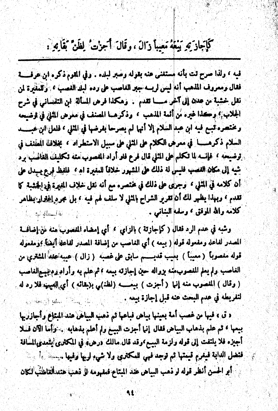 وَشَبَّهَ فِي عَدَمِ الرَّدِّ فَقَالَ (كَإِجَازَتِهِ) بِالزَّايِ، أَيْ إمْضَاءِ الْمَغْصُوبِ مِنْهُ مِنْ إضَافَةِ الْمَصْدَرِ لِفَاعِلِهِ وَمَفْعُولُهُ قَوْلُهُ (بَيْعَهُ) أَيْ الْغَاصِبِ مِنْ إضَافَةِ الْمَصْدَرِ لِفَاعِلِهِ أَيْضًا، وَمَفْعُولُهُ قَوْلُهُ مَغْصُوبًا (مَعِيبًا) بِعَيْبٍ قَدِيمٍ سَابِقٍ عَلَى غَصْبِهِ (زَالَ) عَيْبُهُ عِنْدَ الْمُشْتَرِي مِنْ الْغَاصِبِ وَلَمْ يَعْلَمْ الْمَغْصُوبُ مِنْهُ بِزَوَالِهِ حِينَ إجَازَتِهِ بَيْعَهُ، ثُمَّ عَلِمَ بِهِ وَأَرَادَ رَدَّ بَيْعِ الْغَاصِبِ (وَقَالَ) الْمَغْصُوبُ مِنْهُ إنَّمَا (أَجَزْت) بَيْعَهُ (لِظَنِّ) يَ بِ (بَقَائِهِ) أَيْ الْعَيْبِ فَلَا رَدَّ لَهُ لِتَفْرِيطِهِ فِي عَدَمِ الْبَحْثِ عَنْهُ قَبْلَ إجَازَةِ بَيْعِهِ.
