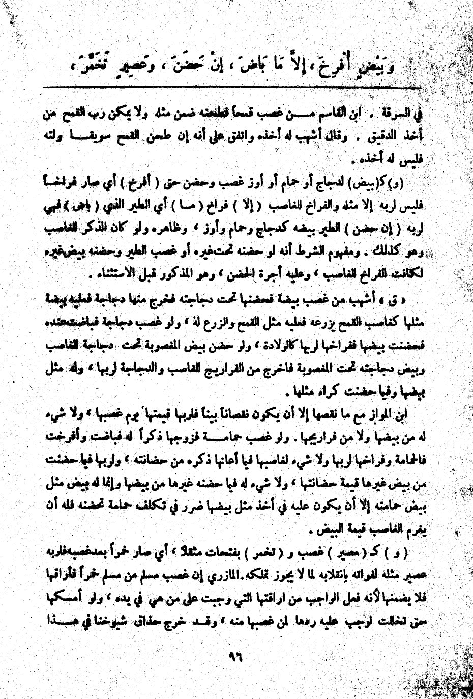 " ق " أَشْهَبُ مَنْ غَصَبَ بَيْضَةً فَحَضَنَهَا تَحْتَ دَجَاجَتِهِ فَخَرَجَ مِنْهَا دَجَاجَةٌ فَعَلَيْهِ بَيْضَةُ مِثْلِهَا كَغَاصِبِ الْقَمْحِ يَزْرَعُهُ فَعَلَيْهِ مِثْلُ الْقَمْحِ وَالزَّرْعُ لَهُ، وَلَوْ غَصَبَ دَجَاجَةً فَبَاضَتْ عِنْدَهُ فَحَضَنَتْ بَيْضَهَا فَفِرَاخُهَا لِرَبِّهَا كَالْوِلَادَةِ، وَلَوْ حَضَنَ بَيْضَ الْمَغْصُوبَةِ تَحْتَ دَجَاجَةٍ لِلْغَاصِبِ وَبَيْضَ دَجَاجَتِهِ تَحْتَ الْمَغْصُوبَةِ فَمَا خَرَجَ مِنْ الْفَرَارِيجِ لِلْغَاصِبِ وَالدَّجَاجَةُ لِرَبِّهَا، وَلَهُ مِثْلُ بَيْضِهَا وَفِيمَا حَضَنَتْ كِرَاءُ مِثْلِهَا. ابْنُ الْمَوَّازِ مَعَ مَا نَقَصَهَا إلَّا أَنْ يَكُونَ نُقْصَانًا بَيِّنًا فَلِرَبِّهَا قِيمَتُهَا يَوْمَ غَصْبِهَا، وَلَا شَيْءَ لَهُ مِنْ بَيْضِهَا وَلَا مِنْ فَرَارِيجِهَا. وَلَوْ غَصَبَ حَمَامَةً فَزَوَّجَهَا ذَكَرًا لَهُ فَبَاضَتْ وَأَفْرَخَتْ فَالْحَمَامَةُ وَفَرَاخُهَا لِرَبِّهَا وَلَا شَيْءَ لِغَاصِبِهَا فِيمَا أَعَانَهَا ذَكَرُهُ مِنْ حَضَانَتِهِ، وَلِرَبِّهَا فِيمَا حَضَنَتْ مِنْ بَيْضِ غَيْرِهَا قِيمَةُ حَضَانَتِهَا، وَلَا شَيْءَ لَهُ فِيمَا حَضَنَهُ غَيْرُهَا مِنْ بَيْضِهَا وَإِنَّمَا لَهُ بَيْضٌ مِثْلُ بَيْضِ حَمَامَتِهِ إلَّا أَنْ يَكُونَ عَلَيْهِ فِي أَخْذِ مِثْلِ بَيْضِهَا ضَرَرٌ فِي تَكَلُّفِ حَمَامَةٍ تَحْضُنُهُ فَلَهُ أَنْ يُغَرِّمَ الْغَاصِبَ قِيمَةَ الْبَيْضِ.