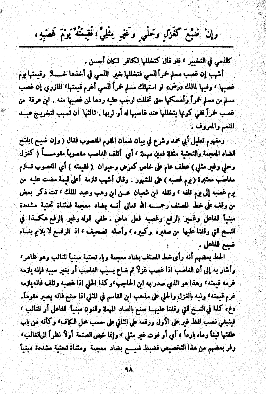 وَشَرَعَ فِي بَيَانِ ضَمَانِ الْمُقَوَّمِ الْمَغْصُوبِ فَقَالَ (وَإِنْ ضَيَّعَ) بِفَتْحِ الضَّادِ الْمُعْجَمَةِ وَالتَّحْتِيَّةِ مُثَقَّلَةً فَعَيْنٌ مُهْمَلَةٌ، أَيْ أَتْلَفَ الْغَاصِبُ مَغْصُوبًا مُقَوَّمًا (كَغَزْلٍ وَحُلِيٍّ وَغَيْرِ مِثْلِيٍّ) عَطْفُ عَامٍّ عَلَى خَاصٍّ كَعَرْضٍ وَحَيَوَانٍ (فَقِيمَتُهُ) أَيْ الْمَغْصُوبِ تَلْزَمُ الْغَاصِبَ مُعْتَبَرَةٌ (يَوْمَ غَصْبِهِ) عَلَى الْمَشْهُورِ. وَقَالَ أَشْهَبُ تَلْزَمُهُ أَعْلَى قِيمَةٍ مَضَتْ عَلَيْهِ مِنْ يَوْمِ غَصْبِهِ إلَى يَوْمِ تَلَفِهِ، وَنَقَلَهُ ابْنُ شَعْبَانَ عَنْ ابْنِ وَهْبٍ وَعَبْدِ الْمَلِكِ تت ذَكَرَ بَعْضُ مَنْ وَقَفَ عَلَى خَطِّ الْمُصَنِّفِ - رَحِمَهُ اللَّهُ تَعَالَى - أَنَّهُ بِضَادٍ مُعْجَمَةٍ فَمُثَنَّاةٌ تَحْتِيَّةٌ مُشَدَّدَةٌ مَبْنِيًّا لِلْفَاعِلِ وَغَيْرُ بِالرَّفْعِ وَغَصَبَهُ فِعْلٌ مَاضٍ. طفي قَوْلُهُ وَغَيْرُ بِالرَّفْعِ هَكَذَا فِي النُّسَخِ الَّتِي وَقَفْنَا عَلَيْهَا مِنْ صَغِيرِهِ وَكَبِيرِهِ، وَأَصْلُهُ تَصْحِيفٌ، إذْ الرَّفْعُ لَا يُلَائِمُ بِنَاءَ ضَيَّعَ لِلْفَاعِلِ.
