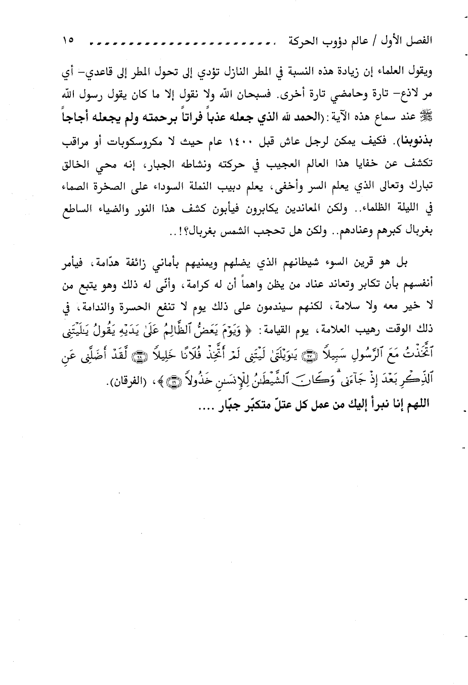 ويقول العلماء إن زيادة هذه النسبة في المطر النازل تؤدي إلى تحول المطر إلى قاعدي - أي مر لاذع - تارة وحامضي تارة أخرى. فسبحان اللّه ولا نقول إلا ما كان يقول رسول اللّه صلى اللّه عليه وسلم عند سماع هذه الآية: (الحمد للّه الذي جعله عذبا فراتا برحمته ولم يجعله أجاجا بذنوبنا). فكيف يمكن لرجل عاش قبل 1400 عام حيث لا مكروسكوبات أو مراقب تكشف عن خفايا هذا العالم العجيب في حركته ونشاطه الجبار، إنه محي الخالق تبارك وتعالى الذي يعلم السر وأخفى، يعلم دبيب النملة السوداء على الصخرة الصماء في الليلة الظلماء ... ولكن المعاندين يكابرون فيأبون كشف هذا النور والضياء الساطع بغربال كبرهم وعنادهم ... ولكن هل تحجب الشمس بغربال؟! ..