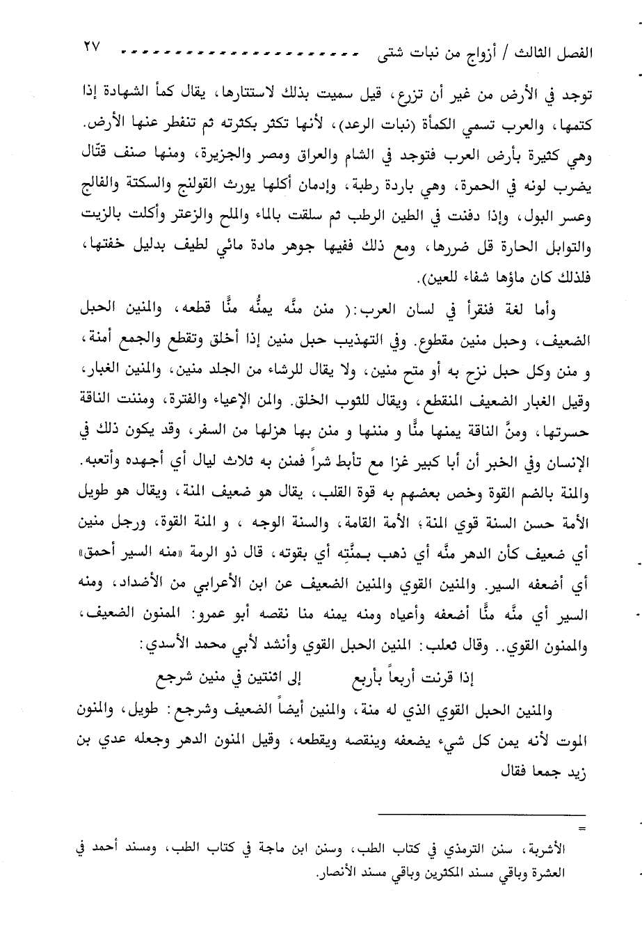 وهي كثيرة بأرض العرب فتوجد في الشام والعراق ومصر والجزيرة، ومنها صنف قتّال يضرب لونه في الحمرة، وهي باردة رطبة، وإدمان أكلها يورث القولنج والسكتة والفالج وعسر البول، وإذا دفنت في الطين الرطب ثم سلقت بالماء والملح والزعتر وأكلت بالزيت والتوابل الحارة قل ضررها، ومع ذلك ففيها جوهر مادة مائي لطيف بدليل خفتها، فلذلك كان ماؤها شفاء للعين).