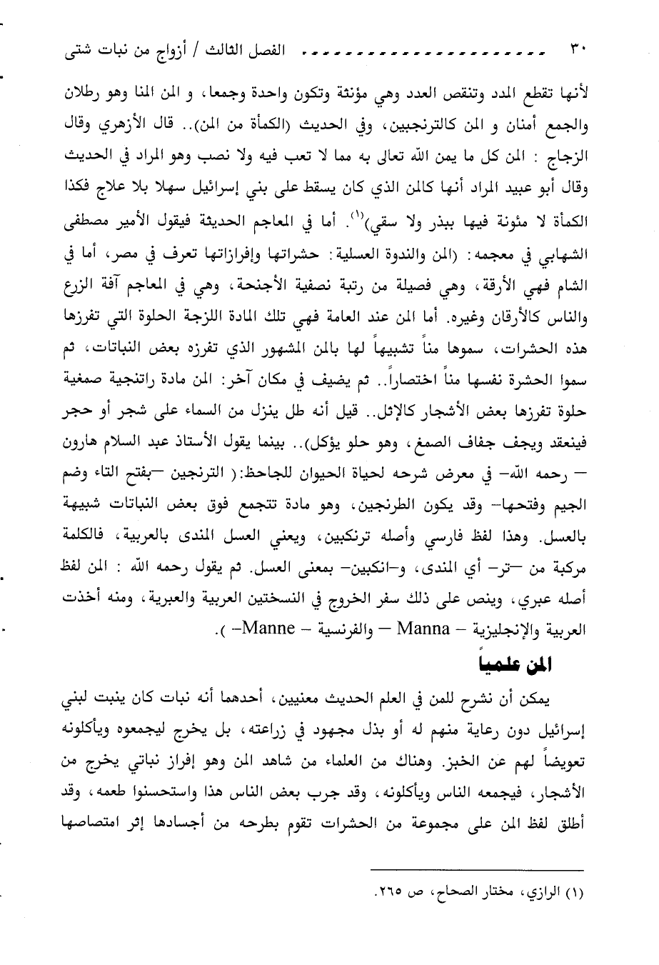 لأنها تقطع المدد وتنقص العدد وهي مؤنثة وتكون واحدة وجمعا، والمن المنا وهو رطلان والجمع أمنان والمن كالترنجبين، وفي الحديث (الكمأة من المن) .. قال الأزهري وقال الزجاج: المن كل ما يمن اللّه تعالى به مما لا تعب فيه ولا نصب وهو المراد في الحديث وقال أبو عبيد المراد أنها كالمن الذي كان يسقط على بني إسرائيل سهلا بلا علاج فكذا الكمأة لا مئونة فيها ببذر ولا سقي) «1». أما في المعاجم الحديثة فيقول الأمير مصطفى الشهابي في معجمه: (المن والندوة العسلية: حشراتها وإفرازاتها تعرف في مصر، أما في الشام فهي الأرقة، وهي فصيلة من رتبة نصفية الأجنحة، وهي في المعاجم آفة الزرع والناس كالأرقان وغيره. أما المن عند العامة فهي تلك المادة اللزجة الحلوة التي تفرزها هذه الحشرات، سموها منا تشبيها لها بالمن المشهور الذي تفرزه بعض النباتات، ثم سموا الحشرة نفسها منا اختصارا ... ثم يضيف في مكان آخر: المن مادة راتنجية صمغية حلوة تفرزها بعض الأشجار كالإثل .. قيل أنه طل ينزل من السماء على شجر أو حجر فينعقد ويجف جفاف الصمغ، وهو حلو يؤكل) ... بينما يقول الأستاذ عبد السلام هارون - رحمه اللّه - في معرض شرحه لحياة الحيوان للجاحظ: (الترنجبين - بفتح التاء وضم الجيم وفتحها - وقد يكون الطرنجبين، وهو مادة تتجمع فوق بعض النباتات شبيهة بالعسل. وهذا لفظ فارسي وأصله ترنكبين، ويعني العسل المندى بالعربية، فالكلمة مركبة من - تر - أي المندى، و - انكبين - بمعنى العسل. ثم يقول رحمه اللّه: المن لفظ أصله عبري، وينص على ذلك سفر الخروج في النسختين العربية والعبرية، ومنه أخذت العربية والإنجليزية - Manna - والفرنسية - Manne - ).