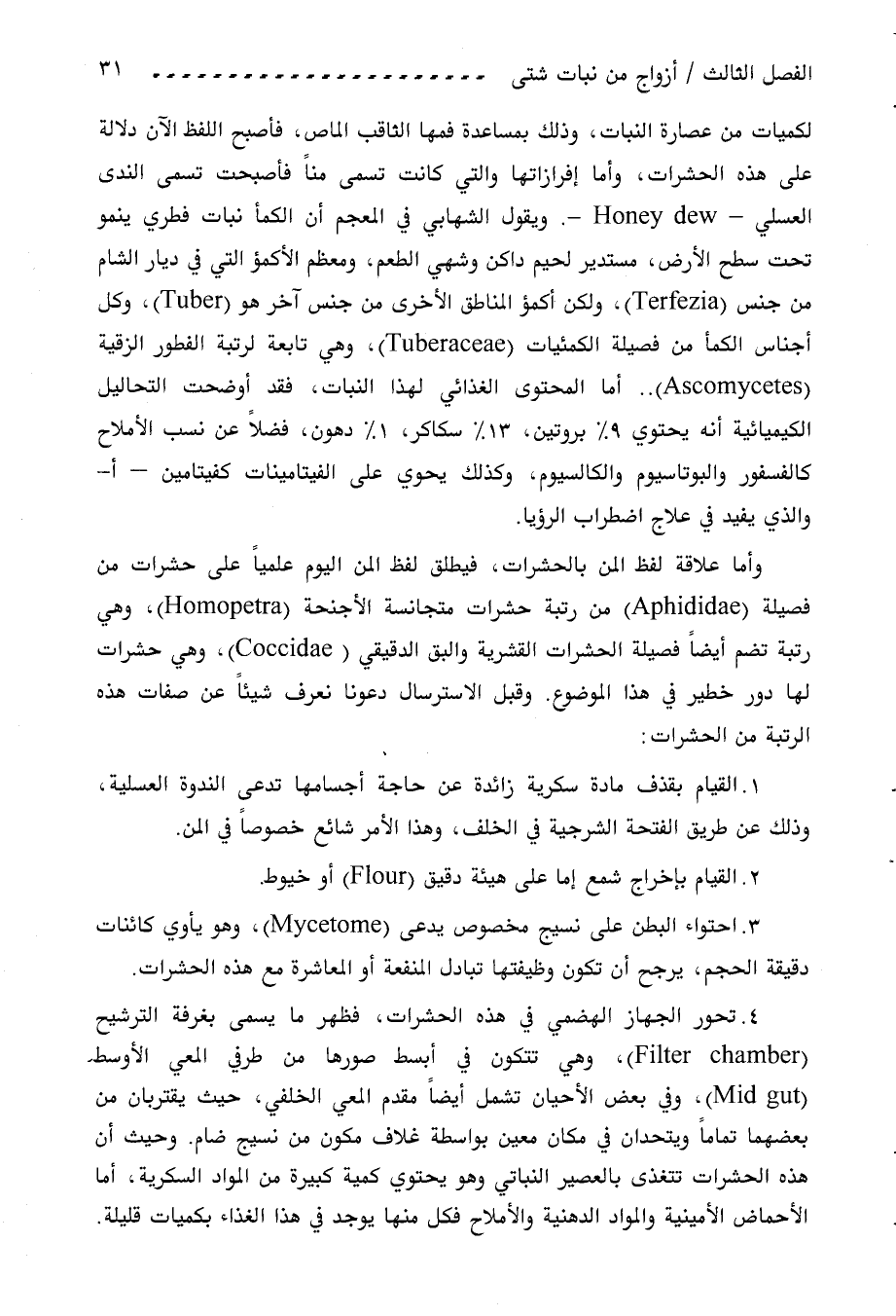 لكميات من عصارة النبات، وذلك بمساعدة فمها الثاقب الماص، فأصبح اللفظ الآن دلالة على هذه الحشرات، وأما إفرازاتها والتي كانت تسمى منا فأصبحت تسمى الندى العسلي - Honey dew - . ويقول الشهابي في المعجم أن الكمأ نبات فطري ينمو تحت سطح الأرض، مستدير لحيم داكن وشهي الطعم، ومعظم الأكمؤ التي في ديار الشام من جنس ( Terfezia)، ولكن أكمؤ المناطق الأخرى من جنس آخر هو ( Tuber)، وكل أجناس الكمأ من فصيلة الكمئيات ( Tuberaceae)، وهي تابعة لرتبة الفطور الزقية ( AScomycetes) ... أما المحتوى الغذائي لهذا النبات، فقد أوضحت التحاليل الكيميائية أنه يحتوي 9 خ بروتين، 13 خ سكاكر، 1 خ دهون، فضلا عن نسب الأملاح كالفسفور والبوتاسيوم والكالسيوم، وكذلك يحوي على الفيتامينات كفيتامين - أ - والذي يفيد في علاج اضطراب الرؤيا.